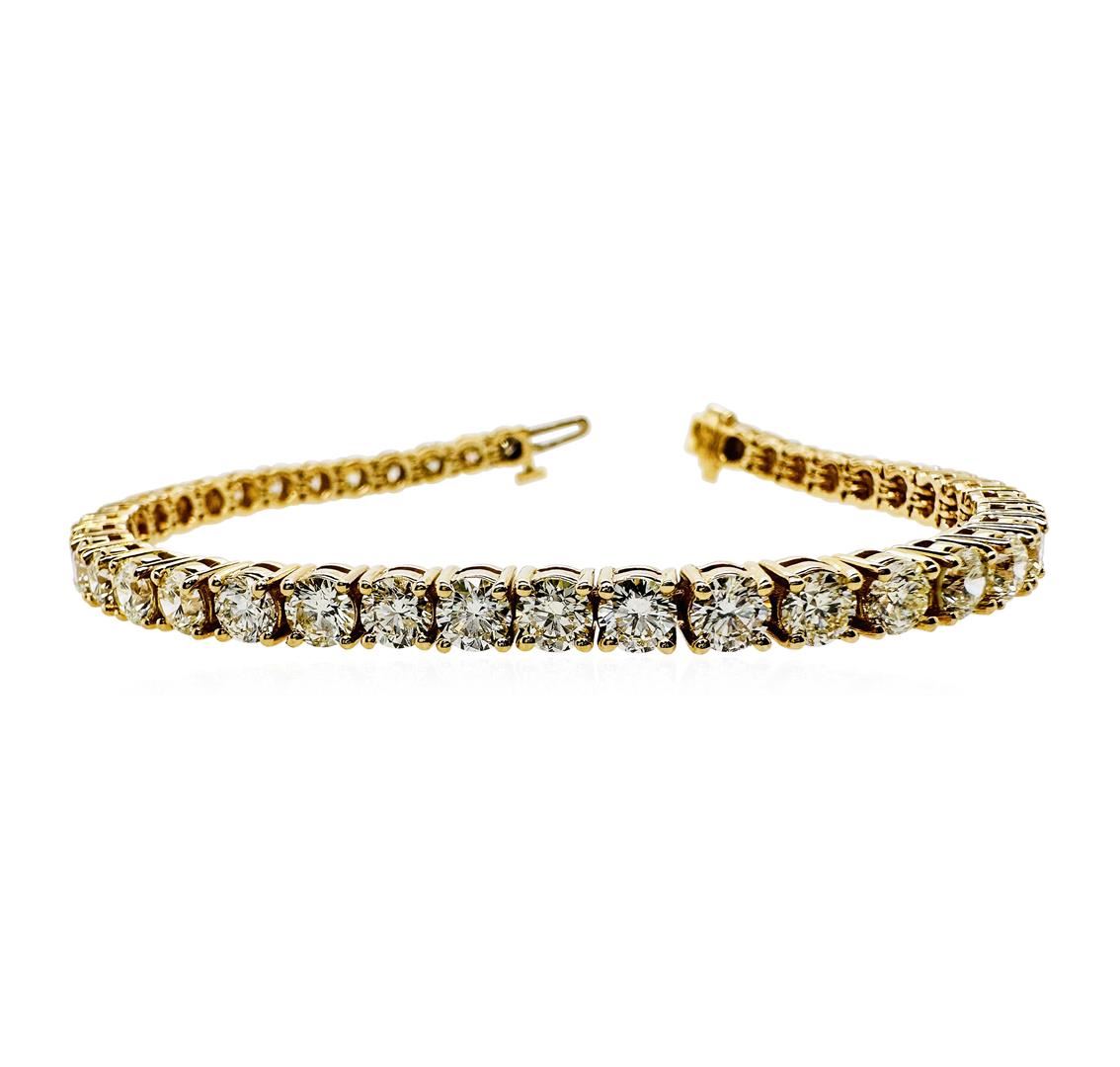 One electronically tested 14KT yellow gold lady's combination cast assembled fashion straight line tennis bracelet with tongue clasp fold-under safety with basket motif with bright finish. Condition new, good workmanship. The featured lady's bracelet measures approximately 6.75 inches length. Identified with markings of "14K" Containing: Forty-one prong set round briliant cut diamonds. 3.85 x 2.45mm (depth est.) 5.00% GTCF I-K VS-1 to SI-1. Very Good Total of Weight Diamonds 10.07ct. Total Weight of Tennis Bracelet 16.30gm. Total Estimated Retail Value 36715.00
