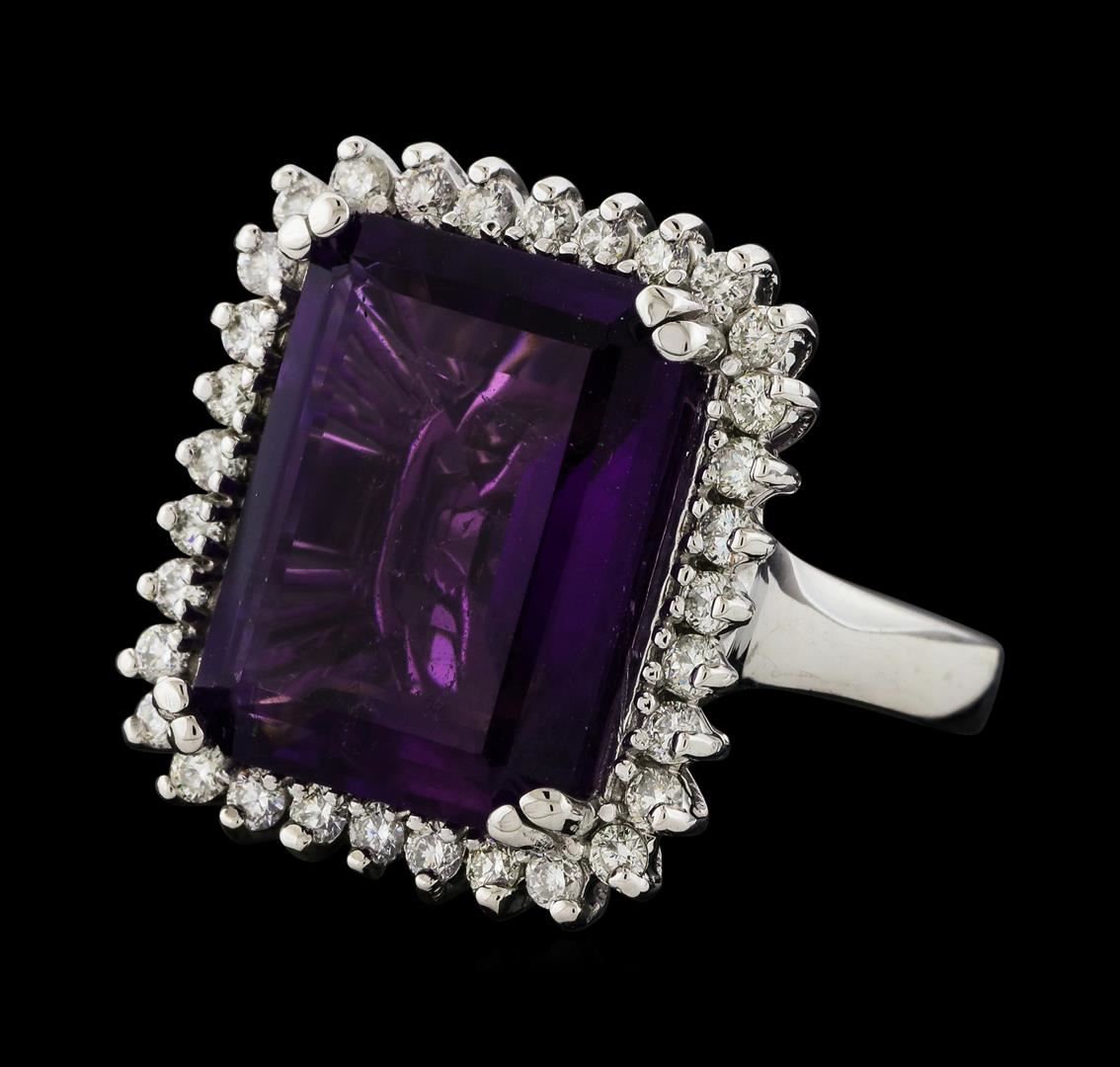 One electronically tested 14KT white gold lady's cast fashion ring with a basket halo with a bright polish finish. The featured lady's ring has a shank measuring 2.75 millimeters wide. Identified with markings of '14K'. Condition is new, good workmanship. Containing: One prong set emerald standard step cut natural amethyst, measuring 16.03 x 12.06 x 6.92mm, (depth est.) 5%. bulge factor, approximate weight of 10.10ct., clarity is slightly included, medium, moderately strong, purple color, (GIA P 5/4), cut is very good. Transmitting light with a minimum of distortion, transparent. Colored gemstones are presumed to have been subjected to commonly used enhancement processes. Graded in the setting. Thirty-Two prong set round brilliant cut diamonds, measuring 1.90 - 1.80 x 1.11mm (depth est.) approximate total weight of 32 Stones = 0.73ct. Graded in the setting. Clarity SI-1 to I-1. Color: G - H Cut Good. Total Weight of Colored Stones 10.10ct.. Total Weight of Diamonds 0.73ct.. Total Weight of Ring 11.80gm. GAS Appraised at $3,800.00.