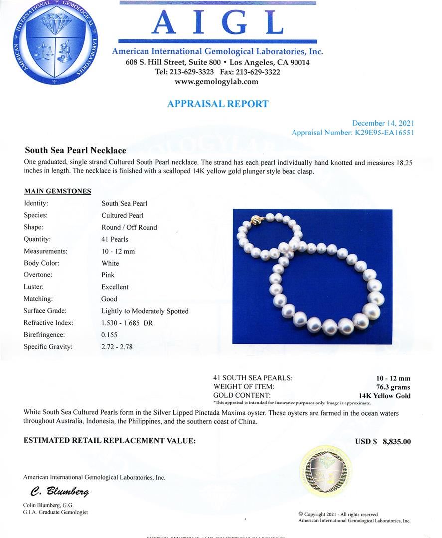 10-12mm White South Sea Pearl Necklace. Please see Photos and Description for all available information. This beautiful necklace features 10-12mm white South Sea cultured pearls in 14K yellow gold plunder bead clasp. The pearls are strung on a durable 18.25-inch length chain, making them a great choice for weddings or any special occasion.