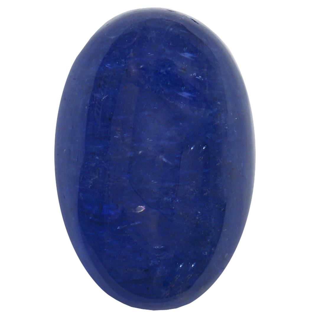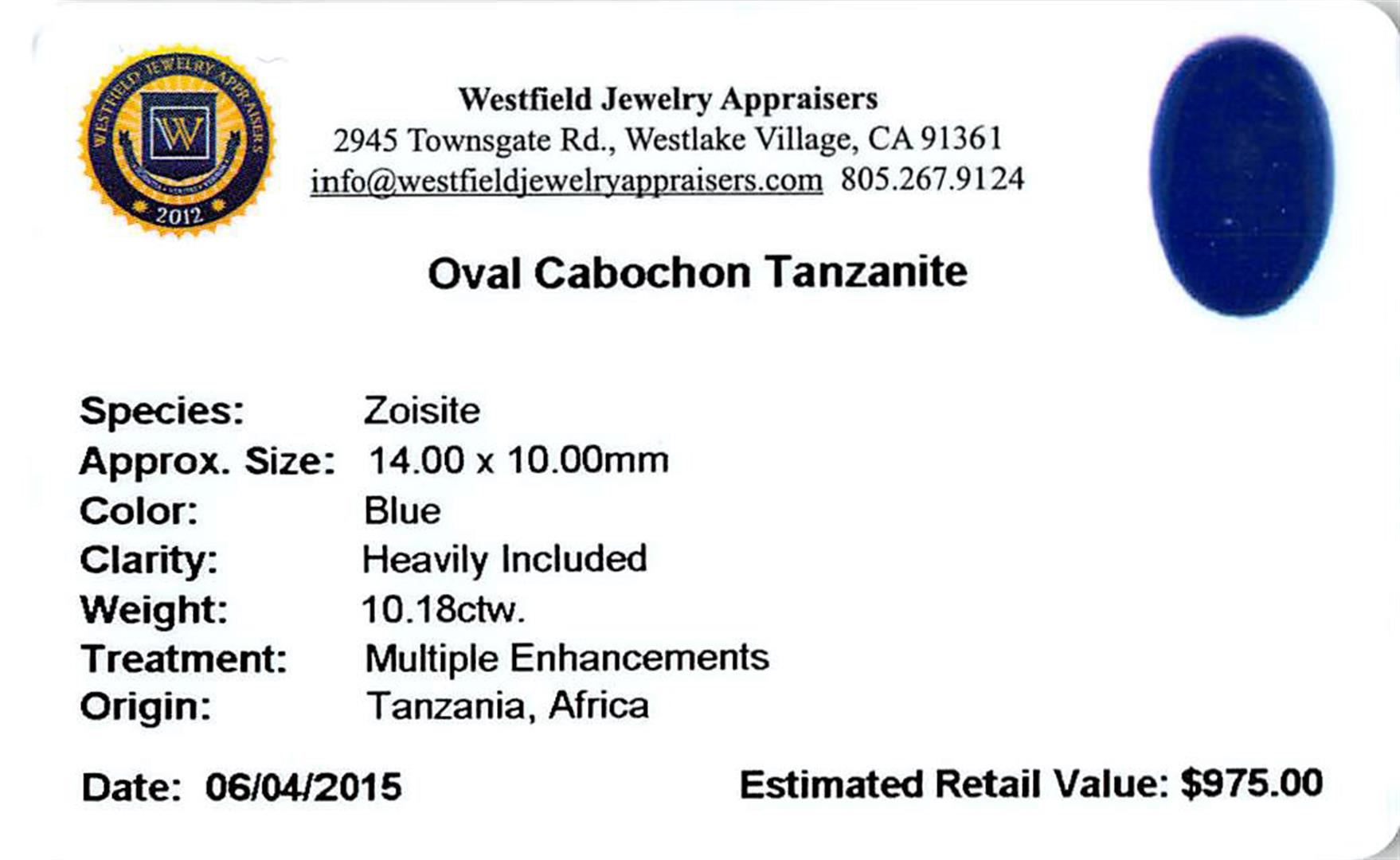 One oval cabochon cut tanzanite, measuring 15.00 x 10.00 x 7.00mm, exact weight 10.18ct., clarity is heavily included, type I, dark, moderately strong, blue color, (GIA B 7/4), cut is good. Transmitting light somewhat diffusely, transparent to translucent. Naturally occurring internal & external characteristics are present. Indications of heat treatment. Westfield Appraised at $975.00.