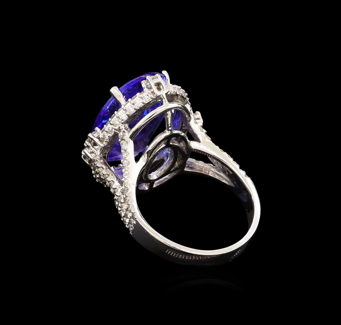 One electronically tested 14KT white gold lady's cast fashion ring with a three row split shank halo with a bright polish finish. The featured lady's ring has a shank measuring 3.10 millimeters wide. Identified with markings of "K14". Condition is new, good workmanship. Containing: One prong set oval modified brilliant cut natural tanzanite, measuring 18.09 x 12.23 x 6.27mm, 4%. bulge factor, approximate weight of 10.18ct., clarity is eye clean, type I, medium, moderately strong, bluish violet color, (GIA bV 5/4), cut is very good. Transmitting light with no distortion, transparent. Colored gemstones are presumed to have been subjected to commonly used enhancement processes. Graded in the setting. Eight prong set round brilliant cut diamonds, measuring 2.00 - 1.90 x 1.19mm (depth est.) approximate total weight of 8 Stones = 0.22ct. Graded in the setting. Clarity: SI-1 to I-1. Color: H - I. Cut Good One Hundred Fourteen prong set round brilliant cut diamonds, measuring 1.35 - 1.25 x 0.81mm (depth est.) approximate total weight of 114 Stones = 0.95ct. Graded in the setting. Clarity: SI-1 to I-1. Color: G - I. Cut Good. Total Weight of Colored Stones 10.18ct. Total Weight of Diamonds 1.17ct. Total Weight of Ring 8.50gm. GAS Appraised at $21,105.00.