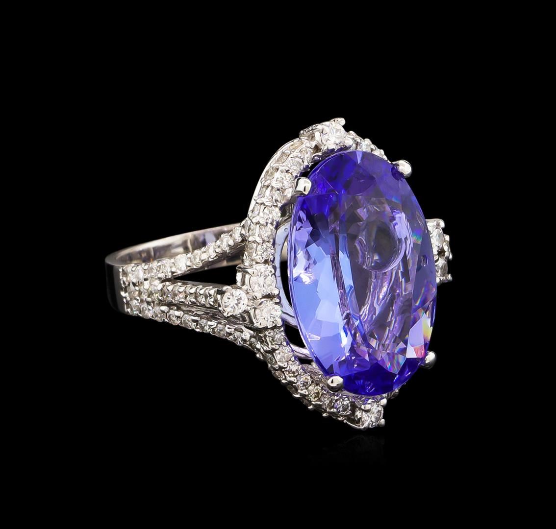 One electronically tested 14KT white gold lady's cast fashion ring with a three row split shank halo with a bright polish finish. The featured lady's ring has a shank measuring 3.10 millimeters wide. Identified with markings of "K14". Condition is new, good workmanship. Containing: One prong set oval modified brilliant cut natural tanzanite, measuring 18.09 x 12.23 x 6.27mm, 4%. bulge factor, approximate weight of 10.18ct., clarity is eye clean, type I, medium, moderately strong, bluish violet color, (GIA bV 5/4), cut is very good. Transmitting light with no distortion, transparent. Colored gemstones are presumed to have been subjected to commonly used enhancement processes. Graded in the setting. Eight prong set round brilliant cut diamonds, measuring 2.00 - 1.90 x 1.19mm (depth est.) approximate total weight of 8 Stones = 0.22ct. Graded in the setting. Clarity: SI-1 to I-1. Color: H - I. Cut Good One Hundred Fourteen prong set round brilliant cut diamonds, measuring 1.35 - 1.25 x 0.81mm (depth est.) approximate total weight of 114 Stones = 0.95ct. Graded in the setting. Clarity: SI-1 to I-1. Color: G - I. Cut Good. Total Weight of Colored Stones 10.18ct. Total Weight of Diamonds 1.17ct. Total Weight of Ring 8.50gm. GAS Appraised at $21,105.00.