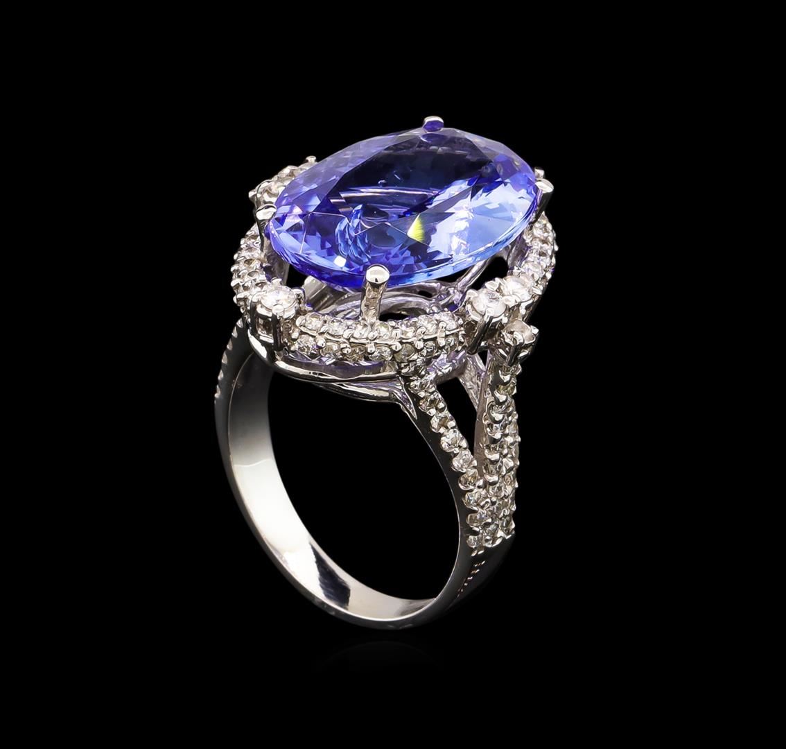 One electronically tested 14KT white gold lady's cast fashion ring with a three row split shank halo with a bright polish finish. The featured lady's ring has a shank measuring 3.10 millimeters wide. Identified with markings of "K14". Condition is new, good workmanship. Containing: One prong set oval modified brilliant cut natural tanzanite, measuring 18.09 x 12.23 x 6.27mm, 4%. bulge factor, approximate weight of 10.18ct., clarity is eye clean, type I, medium, moderately strong, bluish violet color, (GIA bV 5/4), cut is very good. Transmitting light with no distortion, transparent. Colored gemstones are presumed to have been subjected to commonly used enhancement processes. Graded in the setting. Eight prong set round brilliant cut diamonds, measuring 2.00 - 1.90 x 1.19mm (depth est.) approximate total weight of 8 Stones = 0.22ct. Graded in the setting. Clarity: SI-1 to I-1. Color: H - I. Cut Good One Hundred Fourteen prong set round brilliant cut diamonds, measuring 1.35 - 1.25 x 0.81mm (depth est.) approximate total weight of 114 Stones = 0.95ct. Graded in the setting. Clarity: SI-1 to I-1. Color: G - I. Cut Good. Total Weight of Colored Stones 10.18ct. Total Weight of Diamonds 1.17ct. Total Weight of Ring 8.50gm. GAS Appraised at $21,105.00.