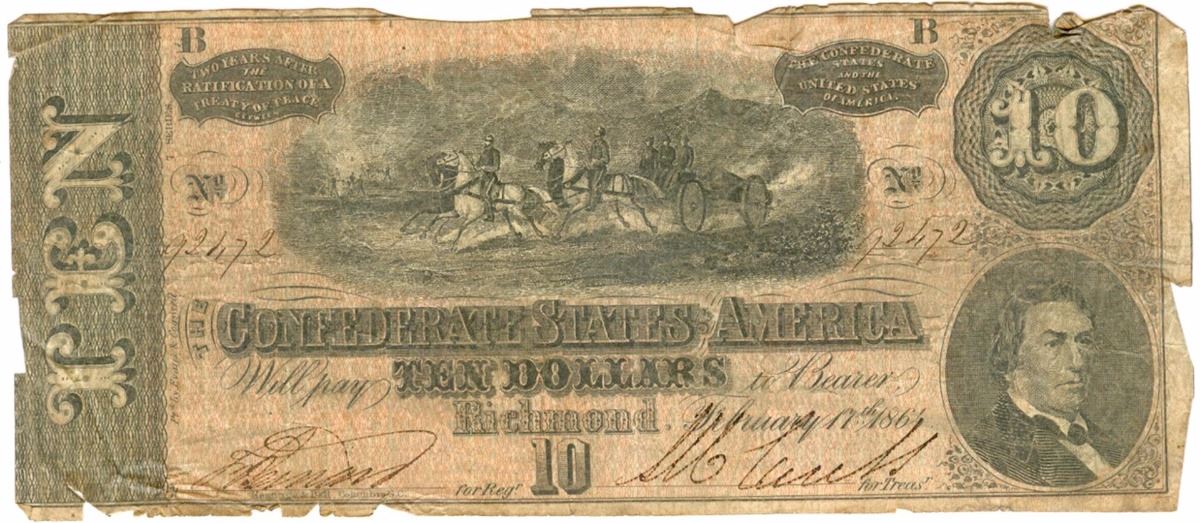 One $10 1864 Richmond Virginia Confederate States of America Bank Note.