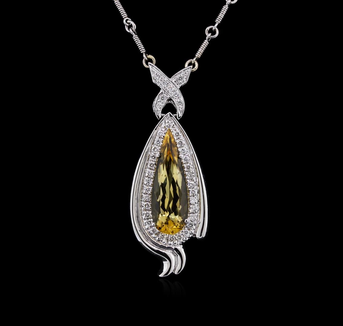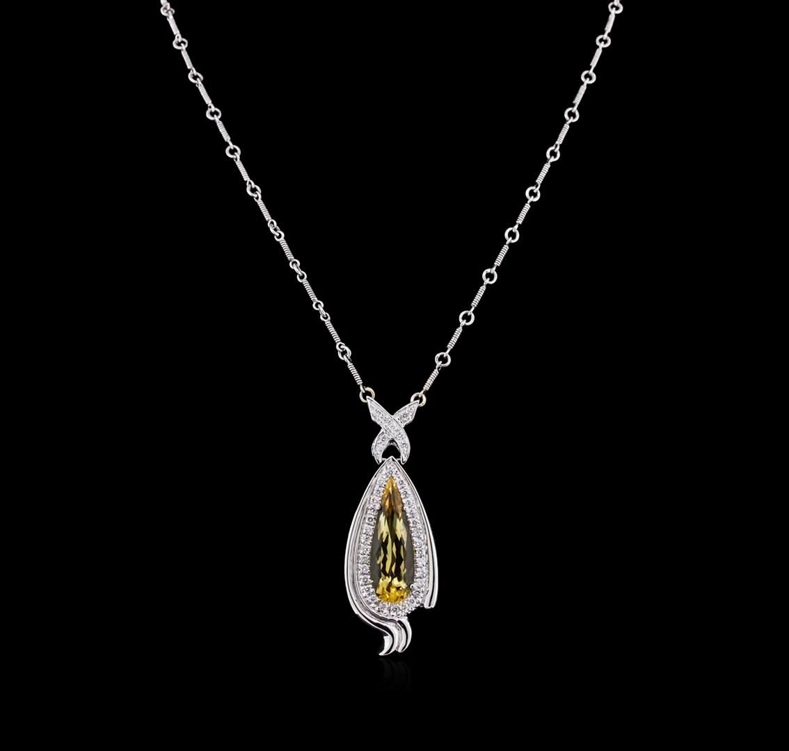 One electronically tested 14KT white gold ladies cast citrine and diamond necklace with a lobster claw clasp with a bright polish finish. 16" in length. Identified with markings of "585". Condition is new. Containing: One prong set pear modified brilliant cut natural citrine quartz, measuring 27.72 x 9.72 x 7.10mm, approximate weight of 10.18ct., clarity is eye clean, type I, medium light, brownish, orangy yellow color, (GIA oY 4/3), cut is good. Forty-Seven prong set round brilliant cut diamonds, measuring 2.00 - 1.80 x 1.14mm (depth est.) approximate total weight of 47 Stones = 1.18ct. Clarity: VS-2 to SI-1. Color: I - J, Cut is Good. Colored gemstones are presumed to have been subjected to commonly used enhancement processes. All diamonds and colored gemstones are graded in the mounting, unless otherwise stated. Total Weight of Colored Stones 10.18ct. Total Weight of Diamonds 1.18ct. Total Weight of Necklace 20.80 grams. GGL Appraised at $4,665.00.