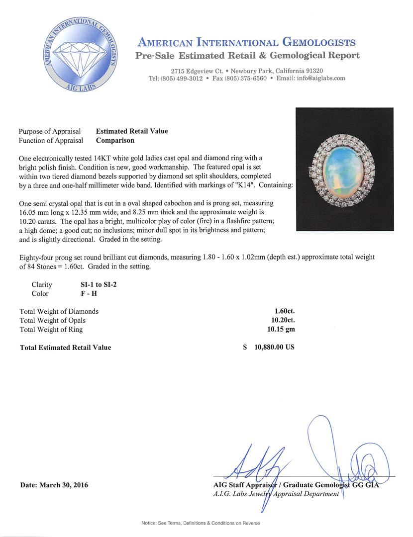 One electronically tested 14KT white gold ladies cast opal and diamond ring with a bright polish finish. The featured opal is set within two tiered diamond bezels supported by diamond set split shoulders, completed by a three and one-half millimeter wide band. Identified with markings of "K14". Condition is new, good workmanship. Containing: One semi crystal opal that is cut in a oval shaped cabochon and is prong set, measuring 16.05 mm long x 12.35 mm wide, and 8.25 mm thick and the approximate weight is 10.20 carats. The opal has a bright, multicolor play of color (fire) in a flashfire pattern; a high dome; a good cut; no inclusions; minor dull spot in its brightness and pattern; and is slightly directional. Graded in the setting. Eighty-Four prong set round brilliant cut diamonds, measuring 1.80 - 1.60 x 1.02mm (depth est.) approximate. Total Weight of 84 Stones = 1.60ct. Graded in the setting. Clarity: SI-1 to SI-2. Color: F - H. Total Weight of Diamonds 1.60ct. Total Weight of Opals 10.20ct. Total Weight of Ring 10.15gm. AIG Appraised at $10,880.00.