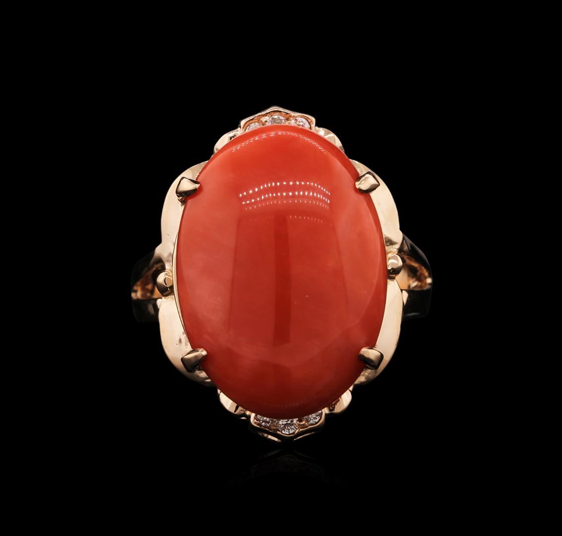 One ring featuring: 14KT rose gold weighing 8.38 grams containing one coral center stone with a total weight of 10.20ct and six diamonds with a total weight of 0.08ct.