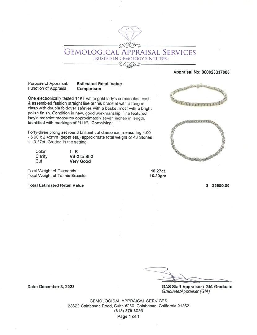 One new 10.27 ctw Diamond Tennis Bracelet - 14KT White Gold. Appraisal Value: $35900. See appraisal for full details.