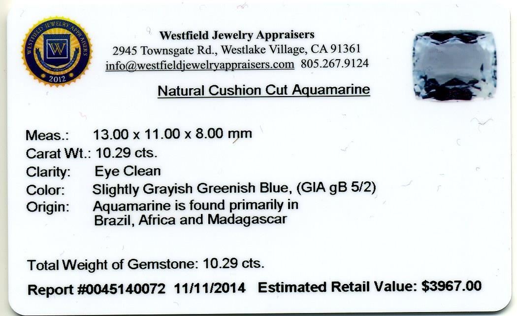 10.29ct Cushion Cut Natural Cushion Cut Aquamarine. Westfield Appraised at $3,967.00.
