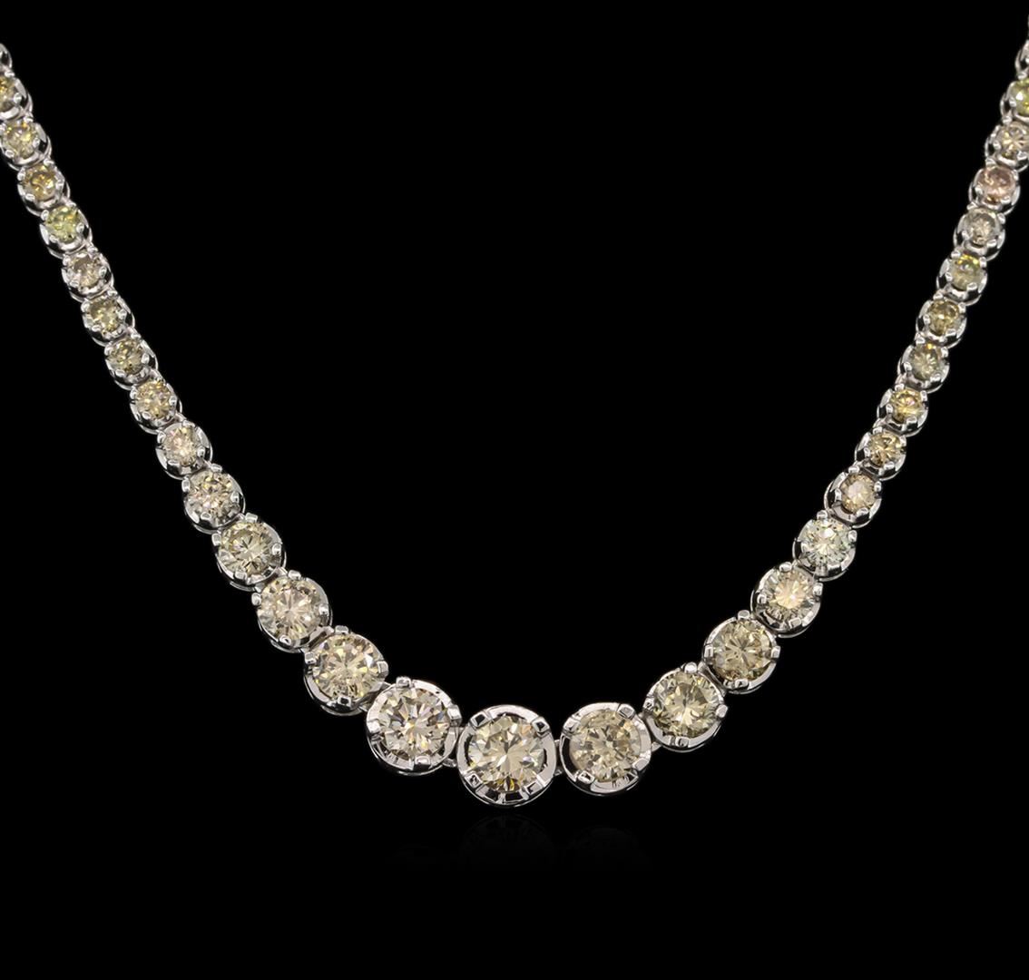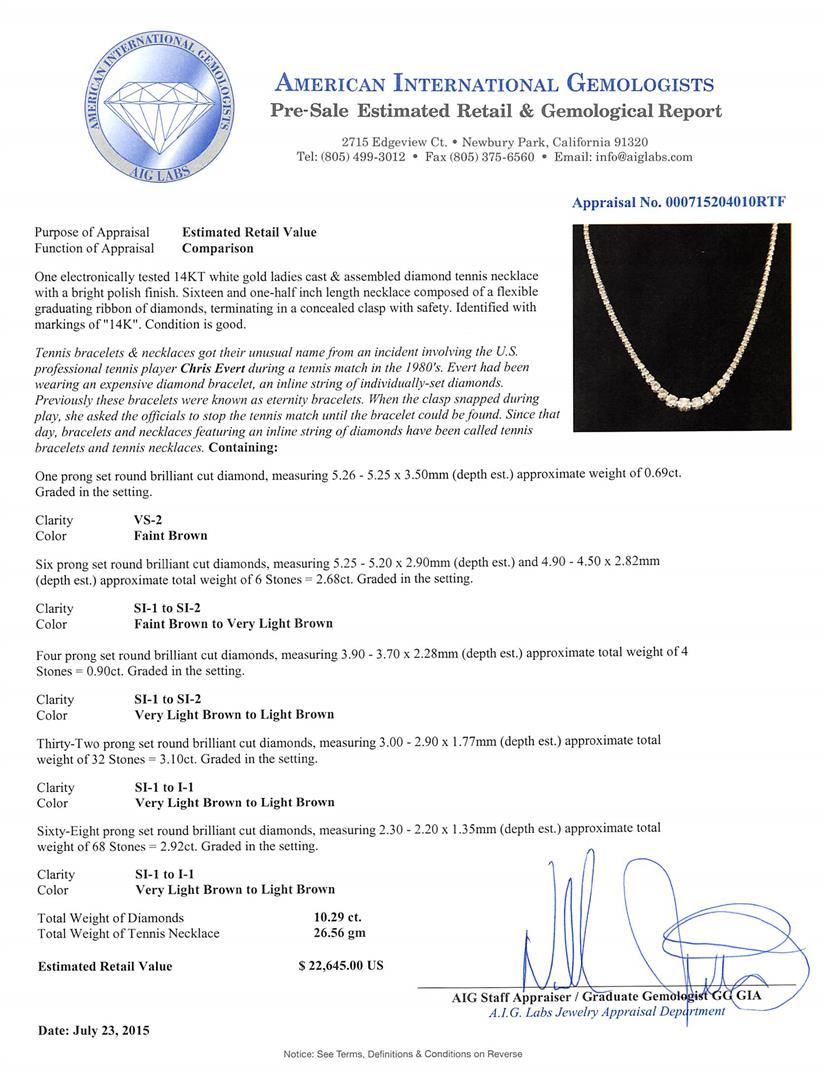 One electronically tested 14KT white gold ladies cast & assembled diamond tennis necklace with a bright polish finish. Sixteen and one-half inch length necklace composed of a flexible graduating ribbon of diamonds, terminating in a concealed clasp with safety. Identified with markings of "14K". Condition is good. Tennis bracelets & necklaces got their unusual name from an incident involving the U.S. professional tennis player Chris Evert during a tennis match in the 1980's. Evert had been wearing an expensive diamond bracelet, an inline string of individually-set diamonds. Previously these bracelets were known as eternity bracelets. When the clasp snapped during play, she asked the officials to stop the tennis match until the bracelet could be found. Since that day, bracelets and necklaces featuring an inline string of diamonds have been called tennis bracelets and tennis necklaces. Containing: One prong set round brilliant cut diamond, measuring 5.26 - 5.25 x 3.50mm (depth est.) approximate weight of 0.69ct. Graded in the setting. Clarity: VS-2 Two prong set round brilliant cut diamonds, measuring 5.25 - 5.20 x 2.90mm (depth est.) approximate. Total Weight of 2 Stones = 1.06ct. Color grade is an average for the pair. Graded in the setting. Clarity: SI-1 to SI-2 Four prong set round brilliant cut diamonds, measuring 4.90 - 4.50 x 2.82mm (depth est.) approximate. Total Weight of 4 Stones = 1.62ct. Color grade is an average for the group. Graded in the setting. Clarity: SI-1 to SI-2 Four prong set round brilliant cut diamonds, measuring 3.90 - 3.70 x 2.28mm (depth est.) approximate. Total Weight of 4 Stones = 0.90ct. Graded in the setting. Clarity SI-1 to SI-2. Color: Very Light Brown to Light Brown. Thirty-Two prong set round brilliant cut diamonds, measuring 3.00 - 2.90 x 1.77mm (depth est.) approximate. Total Weight of 32 Stones = 3.10ct. Graded in the setting. Clarity SI-1 to I-1. Color: Very Light Brown to Light Brown. Sixty-Eight prong set round brilliant cut diamonds, measuring 2.30 - 2.20 x 1.35mm (depth est.) approximate. Total Weight of 68 Stones = 2.92ct. Graded in the setting. Clarity SI-1 to I-1. Color: Very Light Brown to Light Brown. Total Weight of Diamonds 10.29ct. Total Weight of Tennis Necklace 26.56gm. AIG Appraised at $22,645.00.