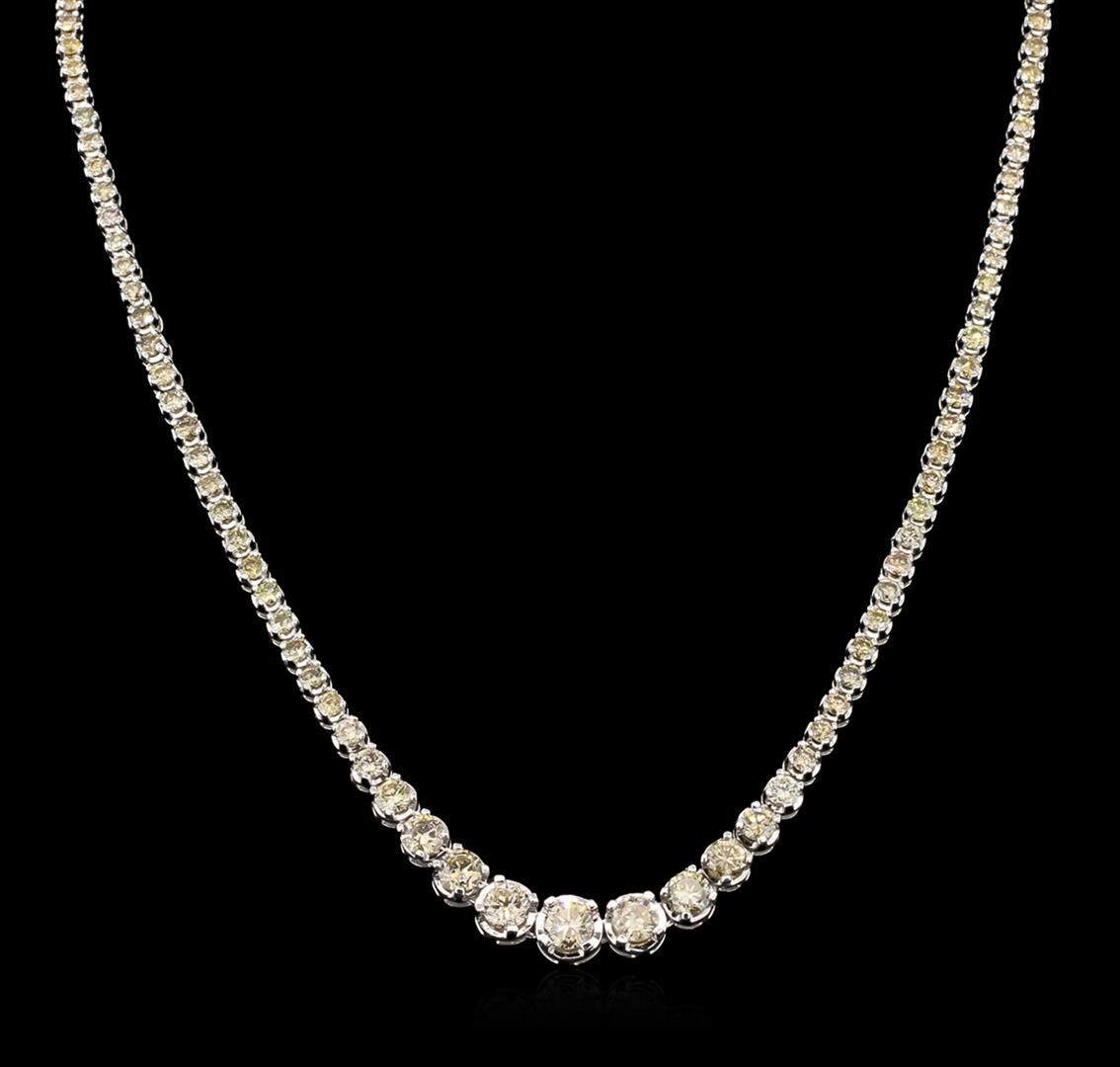 One electronically tested 14KT white gold ladies cast & assembled diamond tennis necklace with a bright polish finish. Sixteen and one-half inch length necklace composed of a flexible graduating ribbon of diamonds, terminating in a concealed clasp with safety. Identified with markings of "14K". Condition is good. Tennis bracelets & necklaces got their unusual name from an incident involving the U.S. professional tennis player Chris Evert during a tennis match in the 1980's. Evert had been wearing an expensive diamond bracelet, an inline string of individually-set diamonds. Previously these bracelets were known as eternity bracelets. When the clasp snapped during play, she asked the officials to stop the tennis match until the bracelet could be found. Since that day, bracelets and necklaces featuring an inline string of diamonds have been called tennis bracelets and tennis necklaces. Containing: One prong set round brilliant cut diamond, measuring 5.26 - 5.25 x 3.50mm (depth est.) approximate weight of 0.69ct. Graded in the setting. Clarity: VS-2 Two prong set round brilliant cut diamonds, measuring 5.25 - 5.20 x 2.90mm (depth est.) approximate. Total Weight of 2 Stones = 1.06ct. Color grade is an average for the pair. Graded in the setting. Clarity: SI-1 to SI-2 Four prong set round brilliant cut diamonds, measuring 4.90 - 4.50 x 2.82mm (depth est.) approximate. Total Weight of 4 Stones = 1.62ct. Color grade is an average for the group. Graded in the setting. Clarity: SI-1 to SI-2 Four prong set round brilliant cut diamonds, measuring 3.90 - 3.70 x 2.28mm (depth est.) approximate. Total Weight of 4 Stones = 0.90ct. Graded in the setting. Clarity SI-1 to SI-2. Color: Very Light Brown to Light Brown. Thirty-Two prong set round brilliant cut diamonds, measuring 3.00 - 2.90 x 1.77mm (depth est.) approximate. Total Weight of 32 Stones = 3.10ct. Graded in the setting. Clarity SI-1 to I-1. Color: Very Light Brown to Light Brown. Sixty-Eight prong set round brilliant cut diamonds, measuring 2.30 - 2.20 x 1.35mm (depth est.) approximate. Total Weight of 68 Stones = 2.92ct. Graded in the setting. Clarity SI-1 to I-1. Color: Very Light Brown to Light Brown. Total Weight of Diamonds 10.29ct. Total Weight of Tennis Necklace 26.56gm. AIG Appraised at $22,645.00.