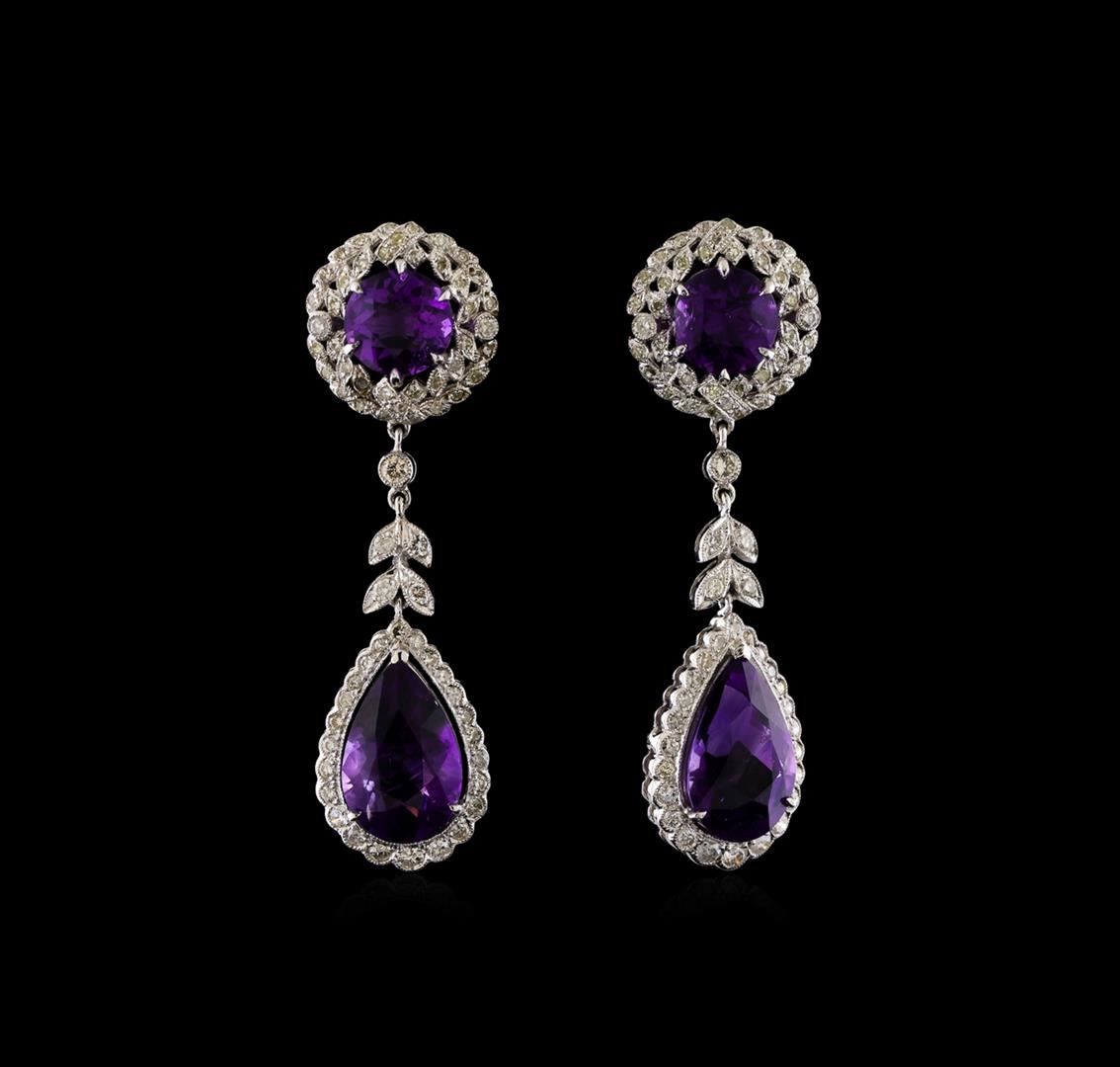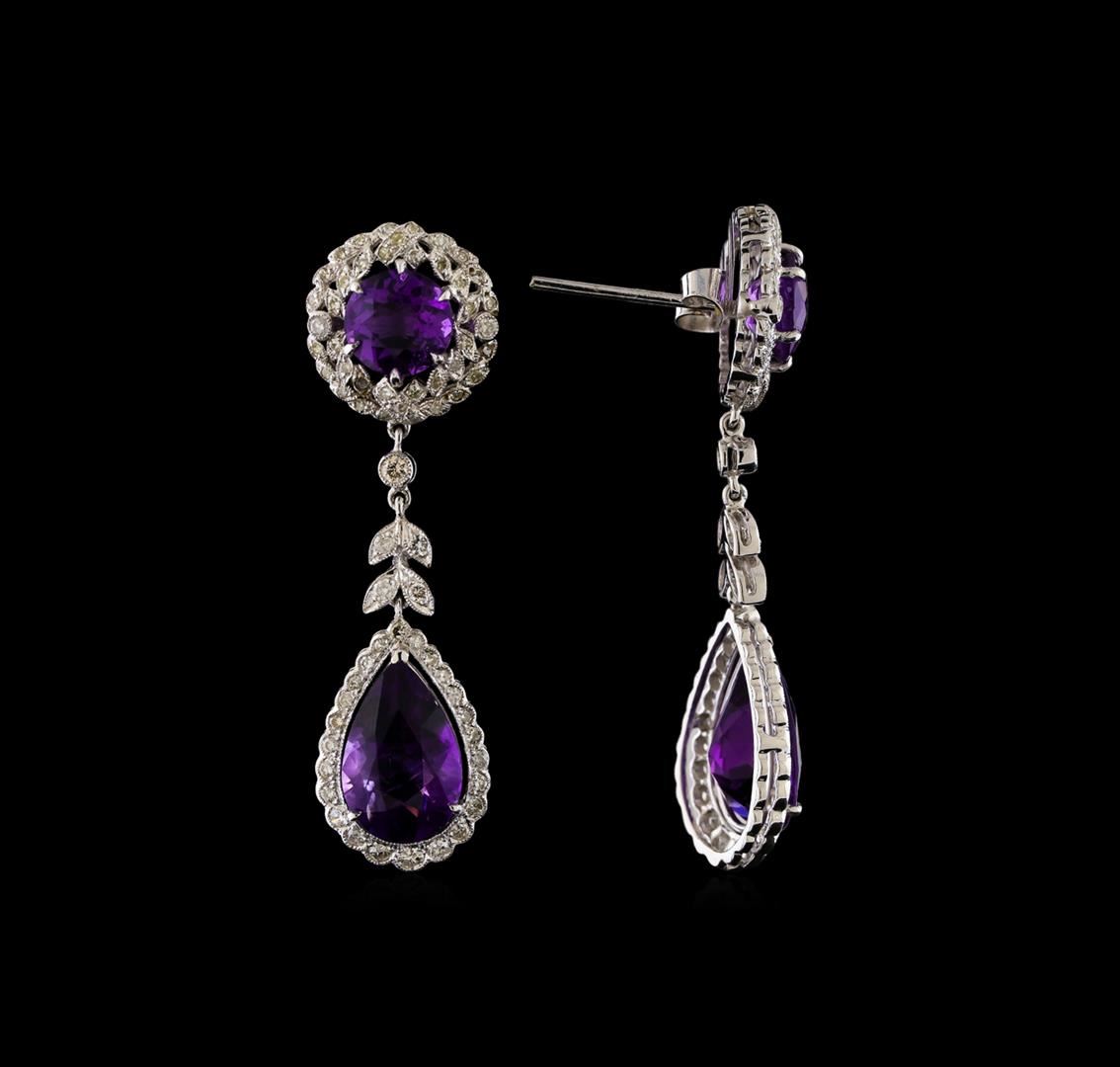 One pair of dangle earrings featuring: 14KT white gold weighing 9.35 grams containing amethysts weighing 10.30ctw and diamonds weighing 1.23ctw.