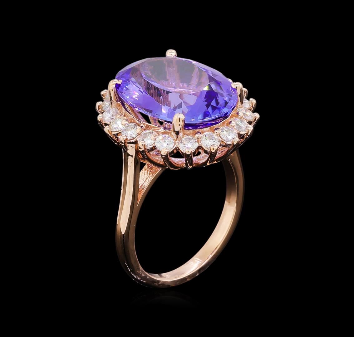 One electronically tested 14KT rose gold lady's cast fashion ring with a basket halo with a bright polish finish. The featured lady's ring has a shank measuring 2.03 millimeters wide. Identified with markings of "14K". Condition is new, good workmanship. Containing: One prong set oval modified brilliant cut natural tanzanite, measuring 16.63 x 12.25 x 7.06mm, 2%. bulge factor, approximate weight of 10.30ct., clarity is eye clean, type I, medium, moderately strong, bluish violet color, (GIA bV 5/4), cut is very good. Transmitting light with no distortion, transparent. Colored gemstones are presumed to have been subjected to commonly used enhancement processes. Graded in the setting. Twenty prong set round brilliant cut diamonds, measuring 2.40 - 2.30 x 1.43mm (depth est.) approximate total weight of 20 Stones = 0.96ct. Graded in the setting. Clarity: VS-2 to SI-2. Color: G - Good. Total Weight of Colored Stones 10.30ct. Total Weight of Diamonds 0.96ct. Total Weight of Ring 8.30gm. GAS Appraised at $20,530.00.