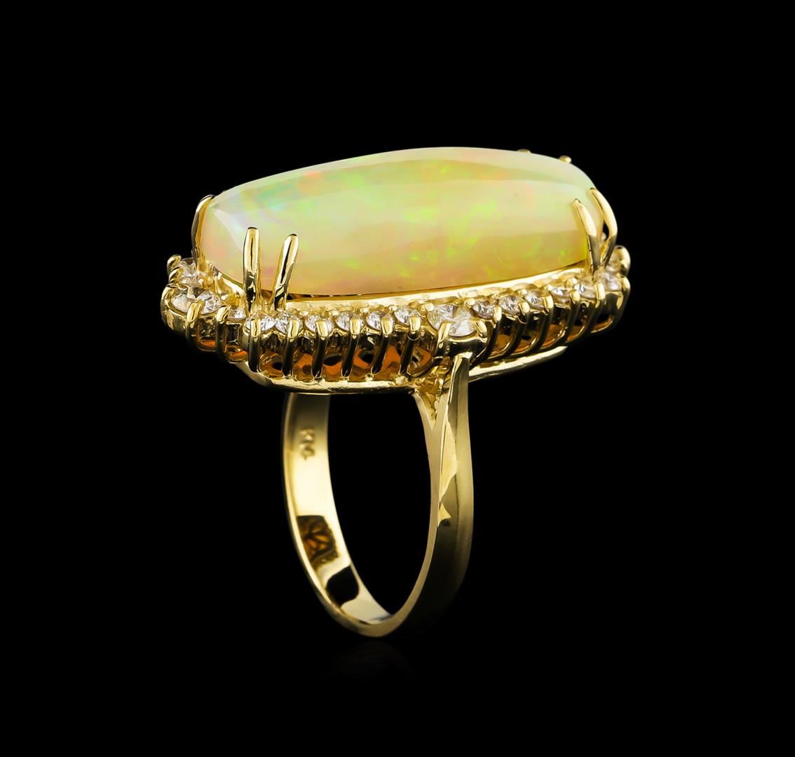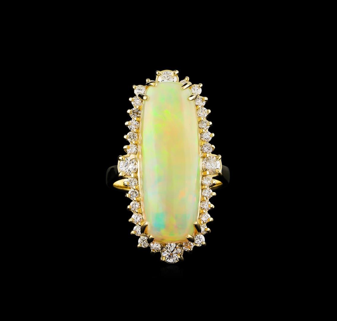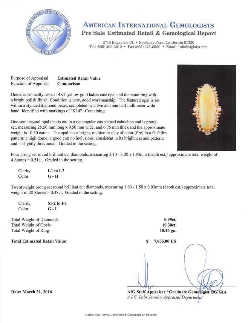 One electronically tested 14KT yellow gold ladies cast opal and diamond ring with a bright polish finish. The featured opal is set within a stylized diamond bezel, completed by a two and one-half millimeter wide band. Identified with markings of "K14". Condition is new, good workmanship. Containing: One semi crystal opal that is cut in a rectangular cus shaped cabochon and is prong set, measuring 25.50 mm long x 9.50 mm wide, and 6.75 mm thick and the approximate weight is 10.30 carats. The opal has a bright, multicolor play of color (fire) in a flashfire pattern; a high dome; a good cut; no inclusions; consistent in its brightness and pattern; and is slightly directional. Graded in the setting. Four prong set round brilliant cut diamonds, measuring 3.10 - 3.00 x 1.83mm (depth est.) approximate total weight of 4 Stones = 0.51ct. Graded in the setting. Clarity: I-1 to I-2. Color: G - H Twenty-Eight prong set round brilliant cut diamonds, measuring 1.60 - 1.50 x 0.93mm (depth est.) approximate total weight of 28 Stones = 0.48ct. Graded in the setting. Clarity: SI-2 to I-1. Color: G - I. Total Weight of Diamonds 0.99ct. Total Weight of Opals 10.30ct. Total Weight of Ring 10.46gm. AIG Appraised at $7,855.00.