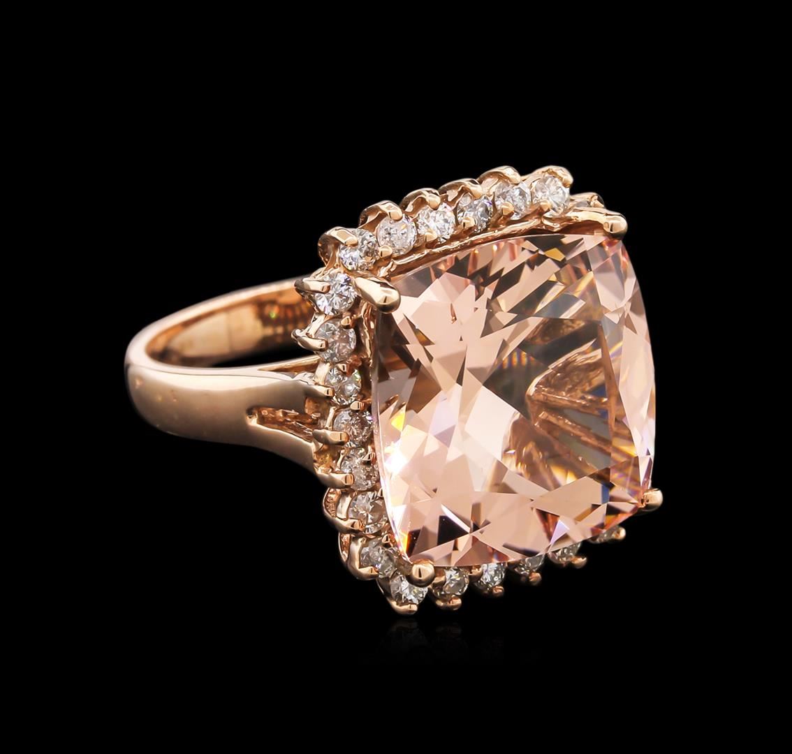 One electronically tested 14KT rose gold lady's cast fashion ring with a basket halo with a bright polish finish. The featured lady's ring has a shank measuring 2.94 millimeters wide. Identified with markings of "14K". Condition is new, good workmanship. Containing: One prong set square cushion modified brilliant cut natural morganite, measuring 14.16 x 14.15 x 8.66mm, approximate weight of 10.31ct., clarity is eye clean, type I, light, very slightly brownish, reddish orange color, (GIA rO 3/3), cut is very good. Transmitting light with no distortion, transparent. Colored gemstones are presumed to have been subjected to commonly used enhancement processes. Graded in the setting. Twenty-Six prong set round brilliant cut diamonds, measuring 2.00 - 1.90 x 1.23mm (depth est.) approximate total weight of 26 Stones = 0.74ct. Graded in the setting. Clarity: SI-2 to I-1. Color: I - Good. Total Weight of Colored Stones 10.31ct. Total Weight of Diamonds 0.74ct. Total Weight of Ring 8.30gm. GAS Appraised at $5,900.00.
