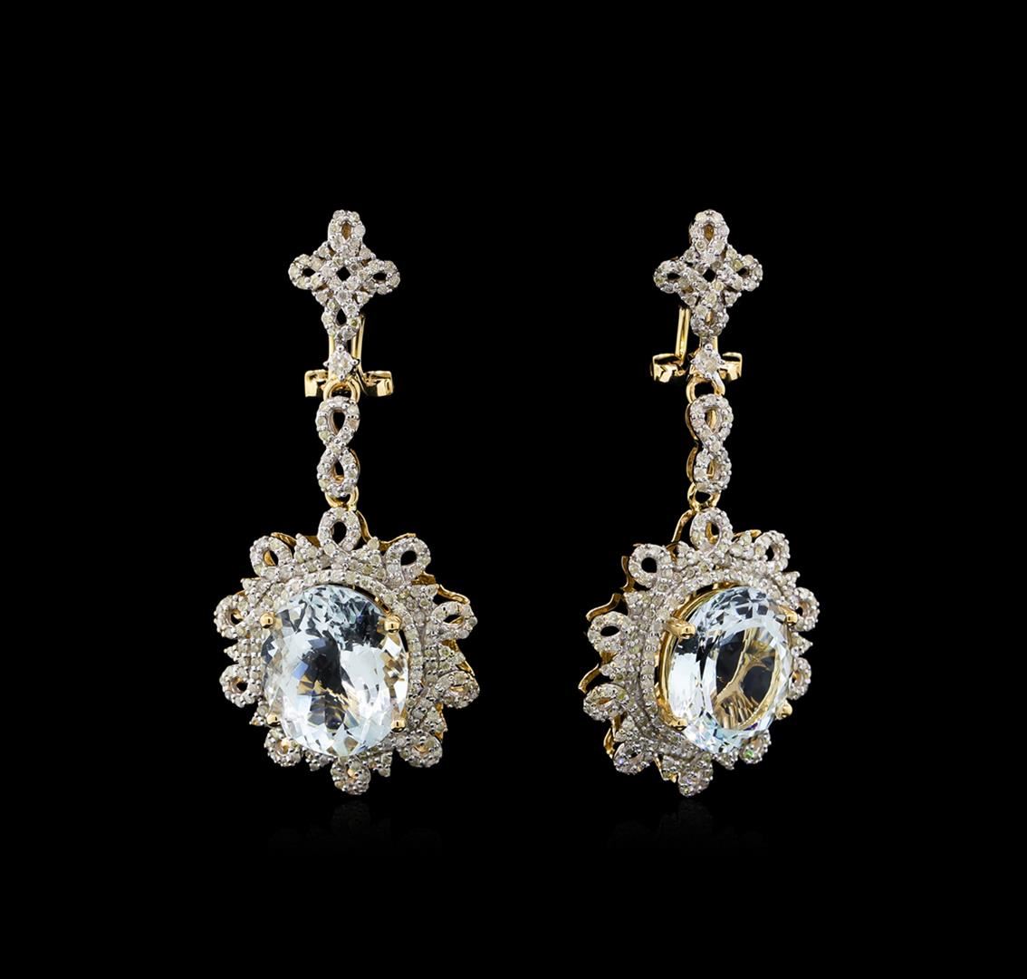 One pair electronically tested 14KT yellow gold lady's combination cast & assembled dangle earrings with Omega clip backs with posts with a bright polish finish. The featured dangle earrings have a drop of 44 millimeters. Trademark is Orianne. Identified with markings of "14K". Condition is new, good workmanship. Containing: Two prong set oval modified brilliant cut natural aquamarines, measuring 12.98 x 10.93 x 6.30mm, approximate total weight of 10.34ct., clarity is slightly included, type I, very light, moderately strong, very slightly greenish blue color, (GIA vslgB 2/4), cut is very good. Transmitting light with no distortion, transparent. Colored gemstones are presumed to have been subjected to commonly used enhancement processes. Graded in the setting. Two prong set round brilliant cut diamonds, measuring 1.90 - 1.80 x 1.15mm (depth est.) approximate total weight of 2 Stones = 0.05ct. Graded in the setting. Clarity: I-1. Color: Good Four Hundred Fifty-Four prong set round brilliant cut diamonds, measuring 1.00 - 0.90 x 0.57mm (depth est.) approximate total weight of 454 Stones = 1.41ct. Graded in the setting. Clarity: I-1 to I-2. Color: I - Good. Total Weight of Colored Stones 10.34ct. Total Weight of Diamonds 1.46ct. Total Weight of Earrings 11.10gm. GAS Appraised at $14,505.00.