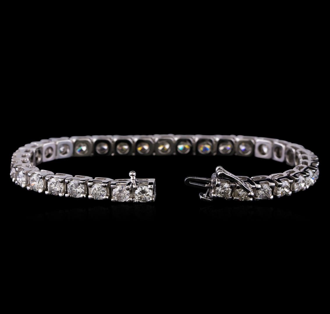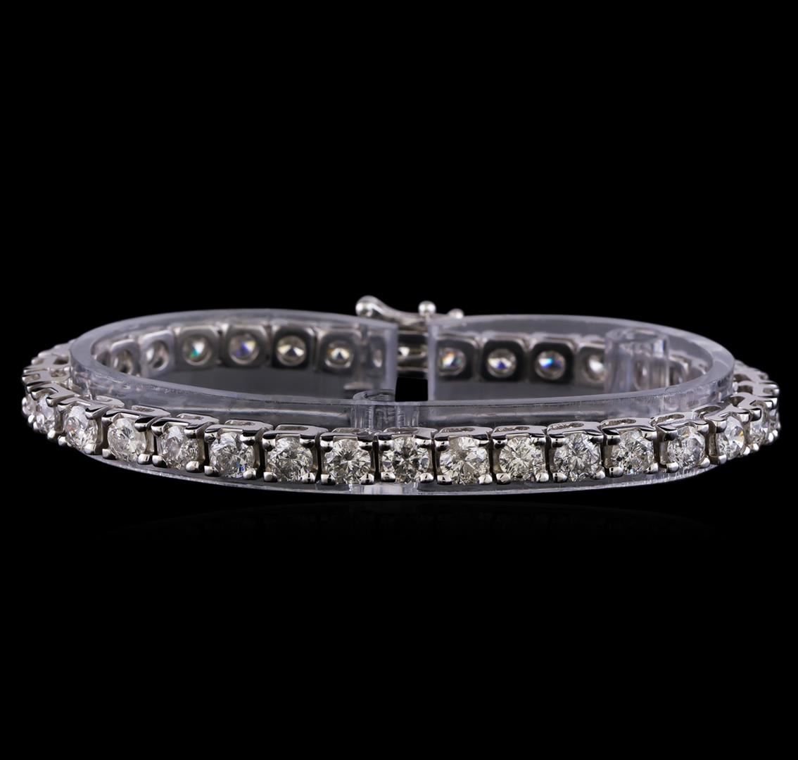 One electronically tested 14KT white gold ladies cast & assembled diamond tennis bracelet. Seven inch length tennis bracelet features a flexible diamond ribbon, terminating in a concealed clasp with safety. Bright polish finish. Tennis bracelets got their unusual name from an incident involving the U.S. professional tennis player Chris Evert during a tennis match in the 1980's. Evert had been wearing an expensive diamond bracelet, an inline string of individually-set diamonds. Previously these bracelets were known as eternity bracelets. When the clasp snapped during play, she asked the officials to stop the tennis match until the bracelet could be found. Since that day, bracelets featuring an inline string of diamonds have been called tennis bracelets. Identified with markings of "14K". Condition is good. Containing: Thirty-Four prong set round brilliant cut diamonds, measuring 4.50 - 4.00 x 2.67mm (depth est.) approximate total weight of 34 Stones = 10.35ct. The color and clarity grades reflect the entire range of color and clarity for this group. Graded in the setting. Clarity: I-1 to I-3. Color: F - I. Total Weight of Diamonds 10.35ct. Total Weight of Bracelet 22.06gm. AIG Appraised at $36,000.00.