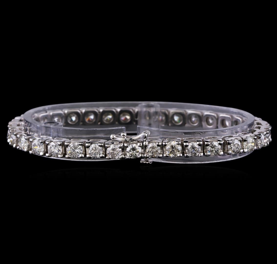 One electronically tested 14KT white gold ladies cast & assembled diamond tennis bracelet. Seven inch length tennis bracelet features a flexible diamond ribbon, terminating in a concealed clasp with safety. Bright polish finish. Tennis bracelets got their unusual name from an incident involving the U.S. professional tennis player Chris Evert during a tennis match in the 1980's. Evert had been wearing an expensive diamond bracelet, an inline string of individually-set diamonds. Previously these bracelets were known as eternity bracelets. When the clasp snapped during play, she asked the officials to stop the tennis match until the bracelet could be found. Since that day, bracelets featuring an inline string of diamonds have been called tennis bracelets. Identified with markings of "14K". Condition is good. Containing: Thirty-Four prong set round brilliant cut diamonds, measuring 4.50 - 4.00 x 2.67mm (depth est.) approximate total weight of 34 Stones = 10.35ct. The color and clarity grades reflect the entire range of color and clarity for this group. Graded in the setting. Clarity: I-1 to I-3. Color: F - I. Total Weight of Diamonds 10.35ct. Total Weight of Bracelet 22.06gm. AIG Appraised at $36,000.00.