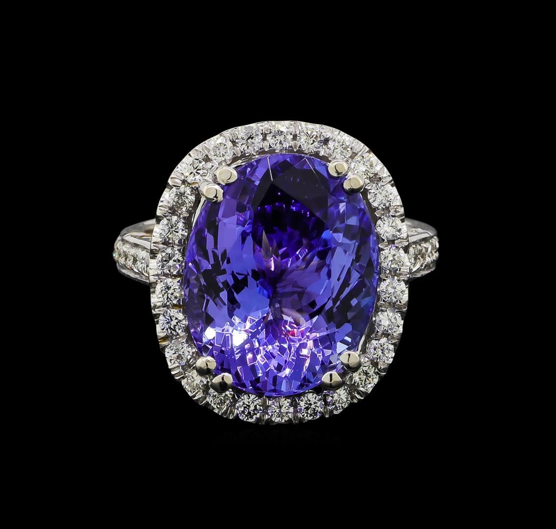 One electronically tested 14KT white gold lady's cast fashion ring with a basket halo with a bright polish with milgrain detailing finish. The featured lady's ring has a diamond set shank measuring 2.57 millimeters wide. Identified with markings of '14K'. Condition is new, good workmanship. Containing: One prong set oval modified brilliant cut natural tanzanite, measuring 14.93 x 11.96 x 8.20mm, (depth est.) approximate weight of 10.35ct., clarity is eye clean, medium, moderately strong, bluish violet color, (GIA bV 5/4), cut is very good. Transmitting light with no distortion, transparent. Colored gemstones are presumed to have been subjected to commonly used enhancement processes. Graded in the setting. Twenty-Six prong set round brilliant cut diamonds, measuring 1.70 - 1.60 x 1.02mm (depth est.) approximate total weight of 26 Stones = 0.45ct. Graded in the setting. Clarity SI-1 to I-1. Color: H - I Cut Good Sixteen prong set round brilliant cut diamonds, measuring 1.50 - 1.45 x 0.92mm (depth est.) approximate total weight of 16 Stones = 0.20ct. Graded in the setting. Clarity SI-1 to SI-2. Color: H - I Cut Good Twelve prong set round brilliant cut diamonds, measuring 1.30 - 1.20 x 0.75mm (depth est.) approximate total weight of 12 Stones = 0.08ct. Graded in the setting. Clarity SI-1 to SI-2. Color: H - I Cut Good. Total Weight of Colored Stones 10.35ct.. Total Weight of Diamonds 0.73ct.. Total Weight of Ring 9.20gm GAS Appraised at $20,240.00.