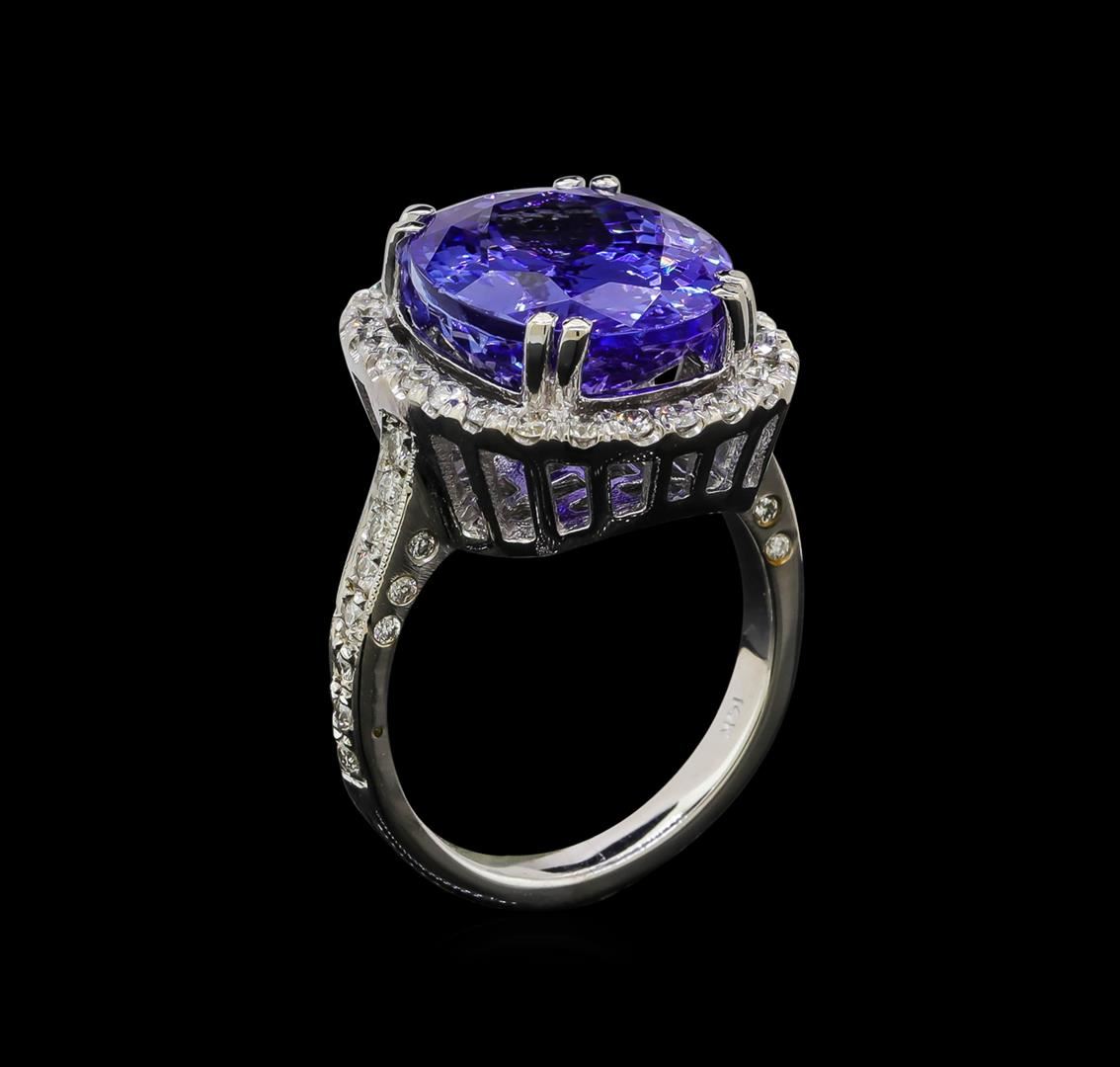 One electronically tested 14KT white gold lady's cast fashion ring with a basket halo with a bright polish with milgrain detailing finish. The featured lady's ring has a diamond set shank measuring 2.57 millimeters wide. Identified with markings of '14K'. Condition is new, good workmanship. Containing: One prong set oval modified brilliant cut natural tanzanite, measuring 14.93 x 11.96 x 8.20mm, (depth est.) approximate weight of 10.35ct., clarity is eye clean, medium, moderately strong, bluish violet color, (GIA bV 5/4), cut is very good. Transmitting light with no distortion, transparent. Colored gemstones are presumed to have been subjected to commonly used enhancement processes. Graded in the setting. Twenty-Six prong set round brilliant cut diamonds, measuring 1.70 - 1.60 x 1.02mm (depth est.) approximate total weight of 26 Stones = 0.45ct. Graded in the setting. Clarity SI-1 to I-1. Color: H - I Cut Good Sixteen prong set round brilliant cut diamonds, measuring 1.50 - 1.45 x 0.92mm (depth est.) approximate total weight of 16 Stones = 0.20ct. Graded in the setting. Clarity SI-1 to SI-2. Color: H - I Cut Good Twelve prong set round brilliant cut diamonds, measuring 1.30 - 1.20 x 0.75mm (depth est.) approximate total weight of 12 Stones = 0.08ct. Graded in the setting. Clarity SI-1 to SI-2. Color: H - I Cut Good. Total Weight of Colored Stones 10.35ct.. Total Weight of Diamonds 0.73ct.. Total Weight of Ring 9.20gm GAS Appraised at $20,240.00.