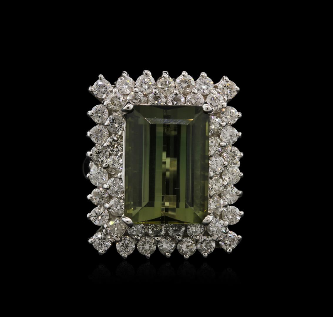 One electronically tested 14KT white gold ladies cast green tourmaline and diamond ring with a bright polish finish. The featured green tourmaline is set within tiered diamond bezels, completed by a two and one-half millimeter wide band. Identified with markings of "K14". Condition is good. Containing: One prong set rectangular step cut natural green tourmaline, measuring 14.50 x 10.50 x 7.25mm, approximate total weight of 10.35ct., clarity is eye clean, type I, dark, very slightly grayish, slightly yellowish green color, (GIA slyG 7/3), cut is good. Transmitting light with no distortion, transparent. Colored Stone Grading Report attached. Graded in the setting. Forty-Eight prong set round brilliant cut diamonds approximate total weight of 48 Stones = 2.56ct. Graded in the setting. Clarity: I-1 to I-2. Color: G - I. Total Weight of Colored Stones 10.35ct. Total Weight of Diamonds 2.56ct. Total Weight of Ring 11.60gm. AIG Appraised at $9,880.00.