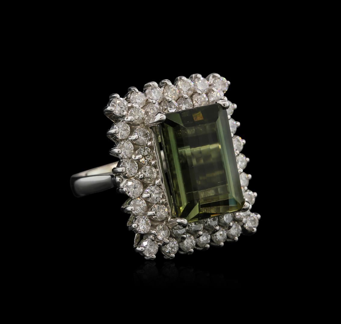 One electronically tested 14KT white gold ladies cast green tourmaline and diamond ring with a bright polish finish. The featured green tourmaline is set within tiered diamond bezels, completed by a two and one-half millimeter wide band. Identified with markings of "K14". Condition is good. Containing: One prong set rectangular step cut natural green tourmaline, measuring 14.50 x 10.50 x 7.25mm, approximate total weight of 10.35ct., clarity is eye clean, type I, dark, very slightly grayish, slightly yellowish green color, (GIA slyG 7/3), cut is good. Transmitting light with no distortion, transparent. Colored Stone Grading Report attached. Graded in the setting. Forty-Eight prong set round brilliant cut diamonds approximate total weight of 48 Stones = 2.56ct. Graded in the setting. Clarity: I-1 to I-2. Color: G - I. Total Weight of Colored Stones 10.35ct. Total Weight of Diamonds 2.56ct. Total Weight of Ring 11.60gm. AIG Appraised at $9,880.00.