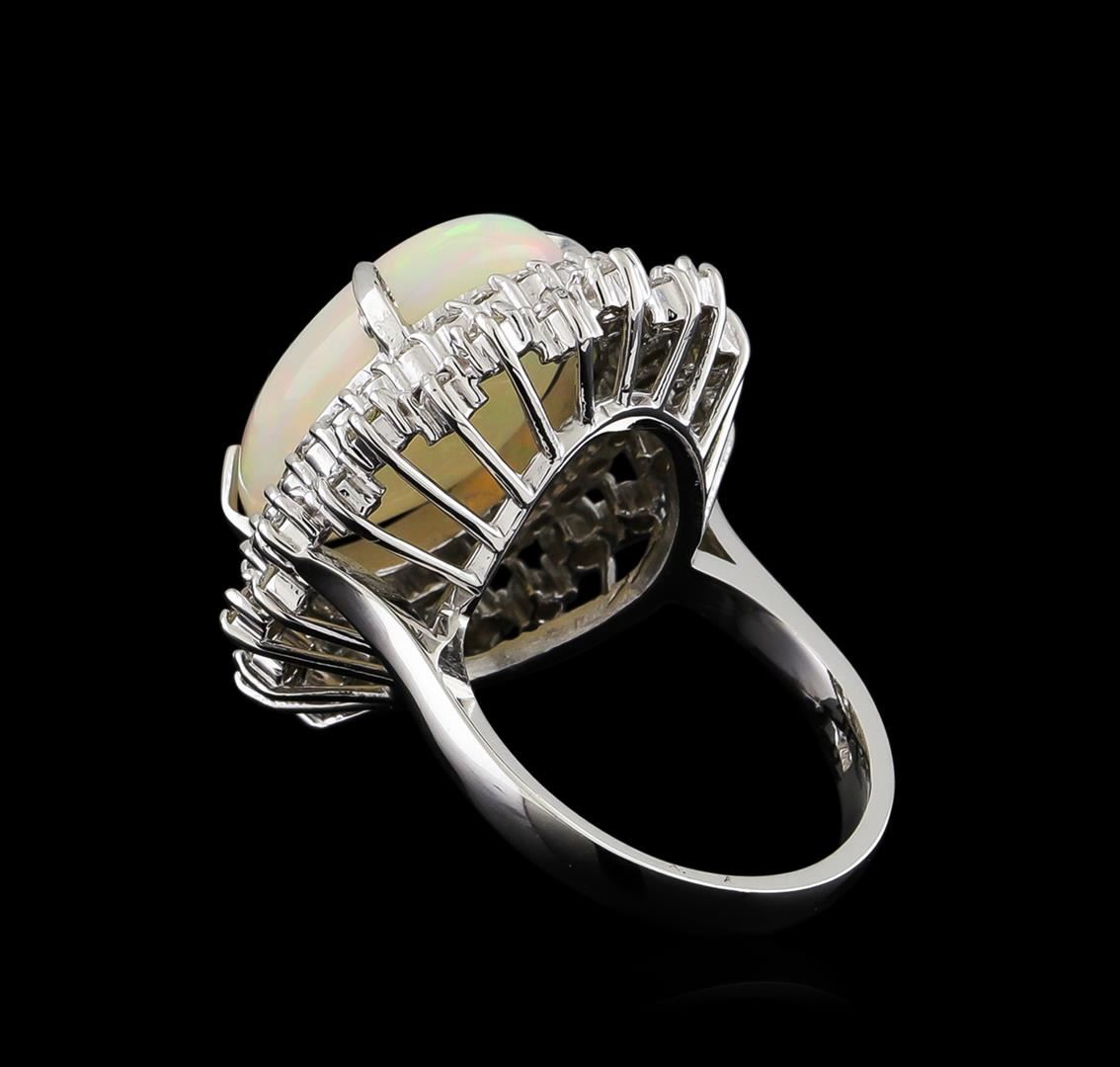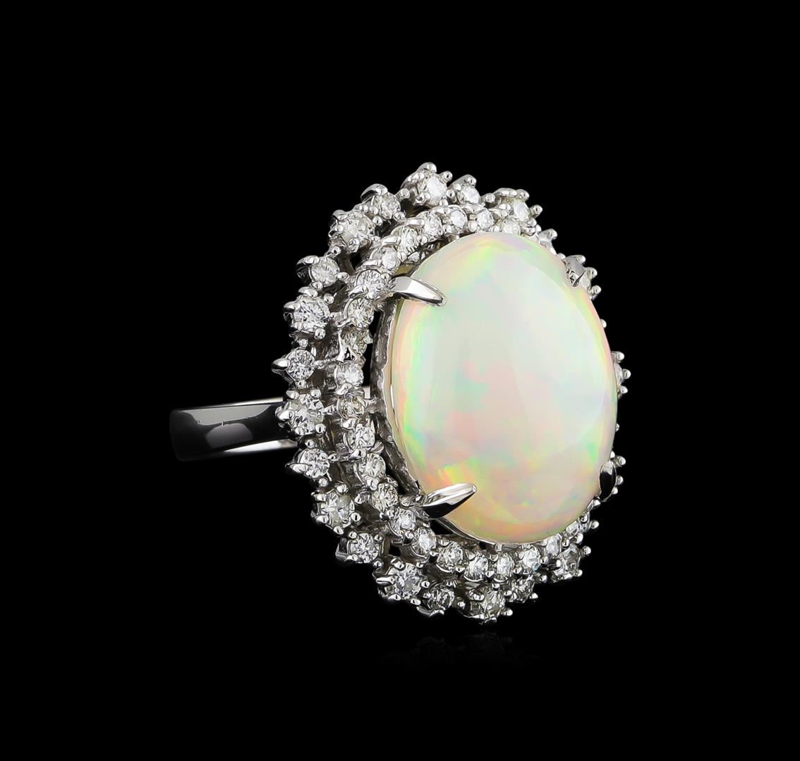 One electronically tested 14KT white gold ladies cast opal and diamond ring with a bright polish finish. The featured opal is set within tiered diamond bezels supported by tapering shoulders, completed by a two and one-half millimeter wide band. Identified with markings of "K14". Condition is new, good workmanship. Containing: One semi crystal opal that is cut in a oval shaped cabochon and is prong set, measuring 17.35 mm long x 13.70 mm wide, and 7.00 mm thick and the approximate weight is 10.37 carats. The opal has a bright, red multicolor play of color (fire) in a flashfire pattern; a medium dome; a good cut; no inclusions; minor dull spot in its brightness and pattern; and is somewhat directional. Graded in the setting. Twelve prong set round brilliant cut diamonds, measuring 2.10 - 2.00 x 1.23mm (depth est.) approximate. Total Weight of 12 Stones = 0.40ct. Graded in the setting. Clarity: SI-2 to I-1. Color: F - H Forty-Four prong set round brilliant cut diamonds, measuring 1.60 - 1.50 x 0.93mm (depth est.) approximate. Total Weight of 44 Stones = 0.68ct. Graded in the setting. Clarity: SI-2 to I-1. Color: F - H. Total Weight of Diamonds 1.08ct. Total Weight of Opals 10.37ct. Total Weight of Ring 9.77gm. AIG Appraised at $9,595.00.