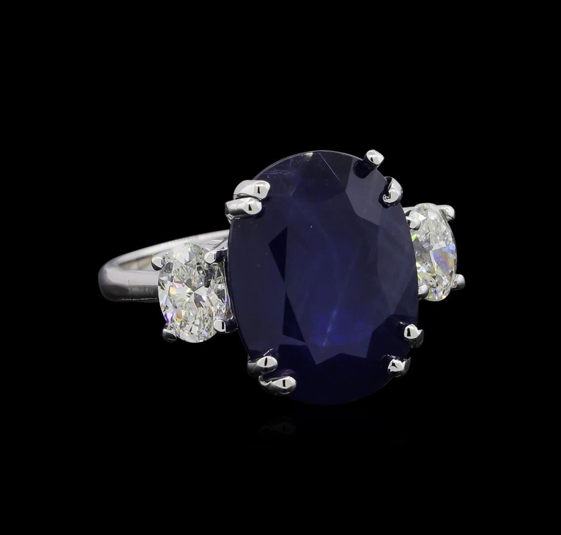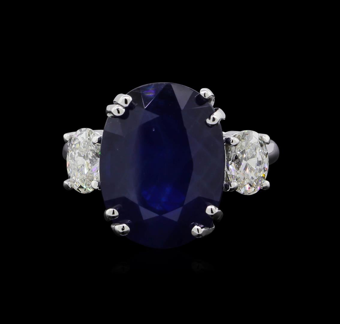 One electronically tested 14KT white gold ladies cast sapphire and diamond ring with a bright polish finish. The featured sapphire is set between a single diamond on either side, completed by a two millimeter wide band. Identified with markings of "14K". Condition is good. Containing: One prong set oval mixed cut natural blue sapphire, measuring 14.60 x 11.00 x 7.10mm, 10%. bulge factor, approximate weight of 10.42ct., clarity is heavily included, type II, dark, very slightly grayish, blue color, (GIA B 7/3), cut is good. Transmitting light somewhat diffusely, transparent to translucent. Naturally occurring internal & external characteristics are present. Colored Stone Grading Report attached. Graded in the setting. Two prong set oval shaped cut diamonds, measuring 5.75 x 4.30 x 2.95mm (depth est.) approximate total weight of 2 Stones = 0.95ct. Clarity: SI-1 to SI-2. Color: F - G. Total Weight of Colored Stones 10.42ct. Total Weight of Diamonds 0.95ct. Total Weight of Ring 5.86gm. AIG Appraised at $26,595.00.