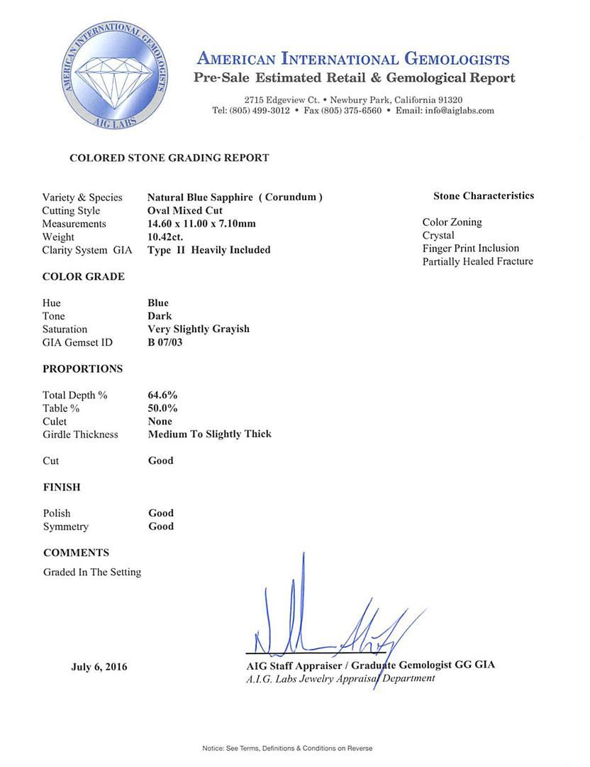 One electronically tested 14KT white gold ladies cast sapphire and diamond ring with a bright polish finish. The featured sapphire is set between a single diamond on either side, completed by a two millimeter wide band. Identified with markings of "14K". Condition is good. Containing: One prong set oval mixed cut natural blue sapphire, measuring 14.60 x 11.00 x 7.10mm, 10%. bulge factor, approximate weight of 10.42ct., clarity is heavily included, type II, dark, very slightly grayish, blue color, (GIA B 7/3), cut is good. Transmitting light somewhat diffusely, transparent to translucent. Naturally occurring internal & external characteristics are present. Colored Stone Grading Report attached. Graded in the setting. Two prong set oval shaped cut diamonds, measuring 5.75 x 4.30 x 2.95mm (depth est.) approximate total weight of 2 Stones = 0.95ct. Clarity: SI-1 to SI-2. Color: F - G. Total Weight of Colored Stones 10.42ct. Total Weight of Diamonds 0.95ct. Total Weight of Ring 5.86gm. AIG Appraised at $26,595.00.