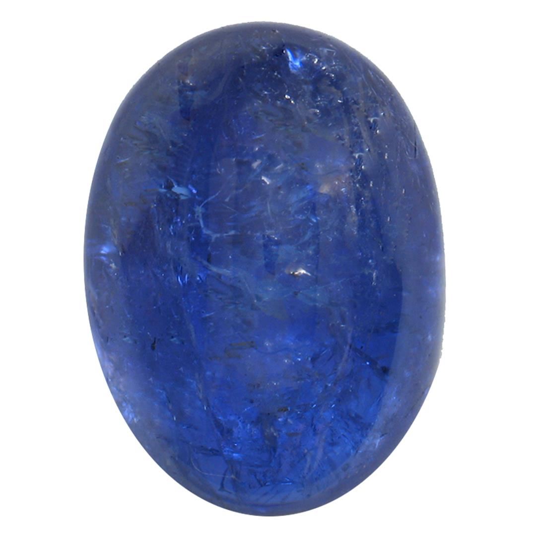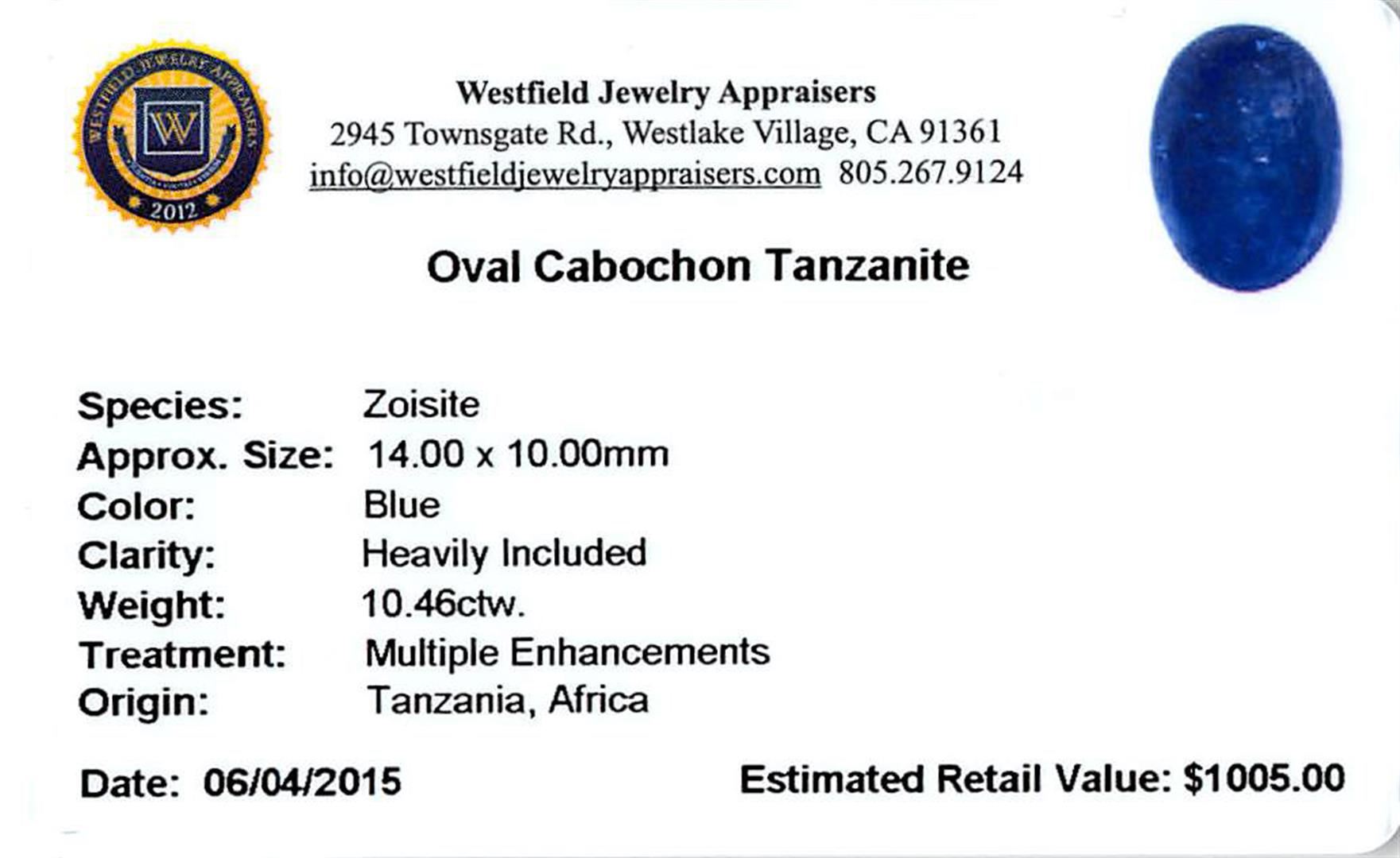 One oval cabochon cut natural tanzanite, measuring 15.00 x 11.00 x 7.00mm, exact weight 10.46ct., clarity is heavily included, type I, dark, moderately strong, blue color, (GIA B 7/4), cut is good. Transmitting light somewhat diffusely, transparent to translucent. Naturally occurring internal & external characteristics are present. Indications of heat treatment. Westfield Appraised at $1,005.00.