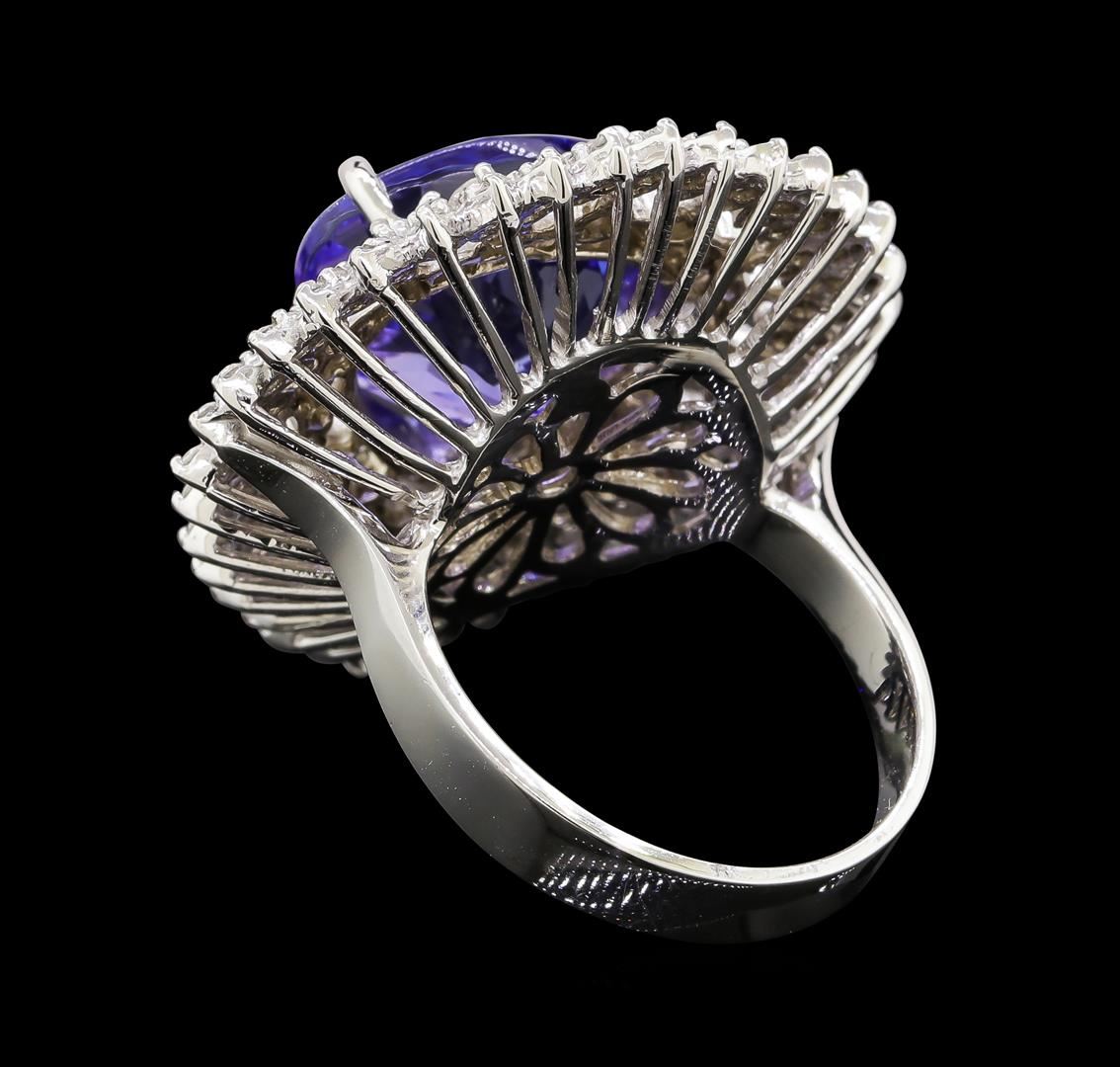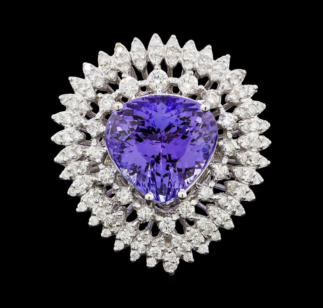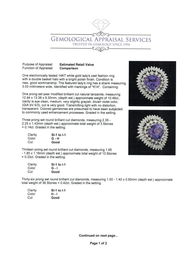 One electronically tested 14KT white gold lady's cast fashion ring with a double basket halo with a bright polish finish. The featured lady's ring has a shank measuring 3.53 millimeters wide. Identified with markings of 'K14'. Condition is new, good workmanship. Containing: One prong set pear modified brilliant cut natural tanzanite, measuring 12.94 x 13.38 x 9.30mm, (depth est.) approximate weight of 10.46ct., clarity is eye clean, medium, very slightly grayish, bluish violet color, (GIA bV 5/3), cut is very good. Transmitting light with no distortion, transparent. Colored gemstones are presumed to have been subjected to commonly used enhancement processes. Graded in the setting. Three prong set round brilliant cut diamonds, measuring 2.35 - 2.25 x 1.43mm (depth est.) approximate total weight of 3 Stones = 0.14ct. Graded in the setting. Clarity SI-1 to I-1. Color: G - H Cut Good Thirteen prong set round brilliant cut diamonds, measuring 1.95 - 1.85 x 1.16mm (depth est.) approximate total weight of 13 Stones = 0.33ct. Graded in the setting. Clarity SI-1 to I-1. Color: G - I Cut Good Thirty-Six prong set round brilliant cut diamonds, measuring 1.50 - 1.40 x 0.90mm (depth est.) approximate total weight of 36 Stones = 0.42ct. Graded in the setting. Clarity SI-1 to I-1. Color: H - I Cut Good Seventy-Two prong set round brilliant cut diamonds, measuring 1.20 - 1.15 x 0.73mm (depth est.) approximate total weight of 72 Stones = 0.44ct. Graded in the setting. Clarity SI-1 to I-1. Color: G - I Cut Good. Total Weight of Colored Stones 10.46ct.. Total Weight of Diamonds 1.33ct.. Total Weight of Ring 11.90gm. GAS Appraised at $15,820.00.