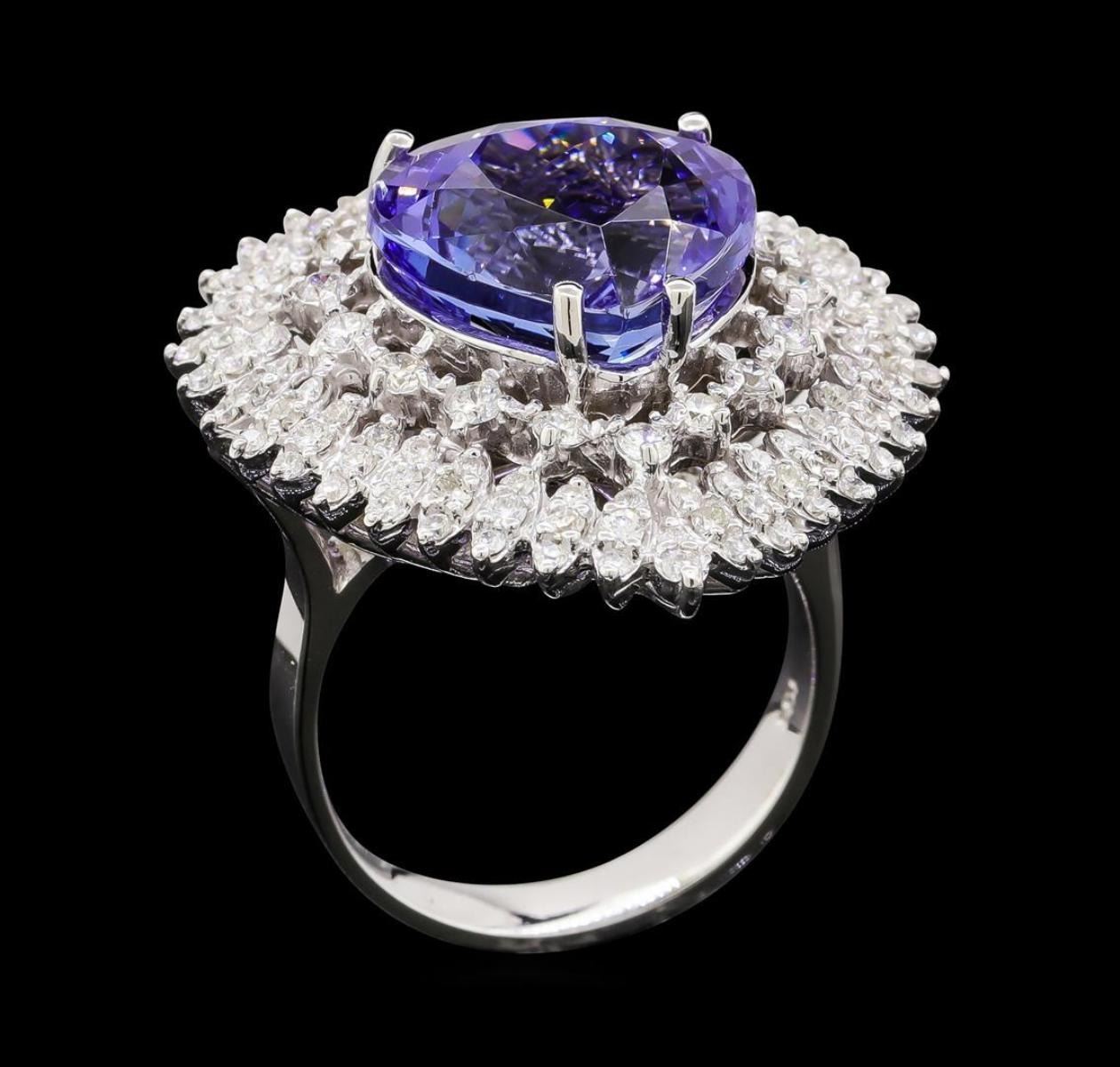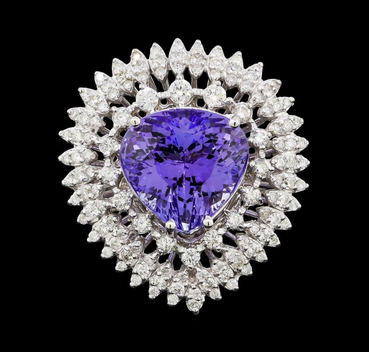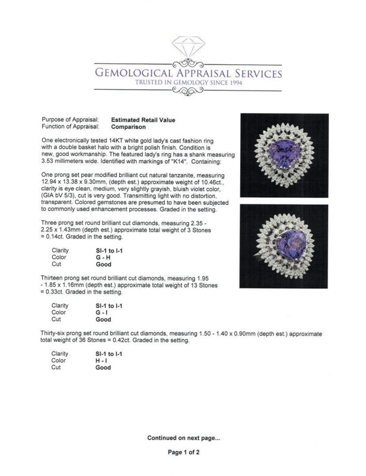 One electronically tested 14KT white gold lady's cast fashion ring with a double basket halo with a bright polish finish. The featured lady's ring has a shank measuring 3.53 millimeters wide. Identified with markings of 'K14'. Condition is new, good workmanship. Containing: One prong set pear modified brilliant cut natural tanzanite, measuring 12.94 x 13.38 x 9.30mm, (depth est.) approximate weight of 10.46ct., clarity is eye clean, medium, very slightly grayish, bluish violet color, (GIA bV 5/3), cut is very good. Transmitting light with no distortion, transparent. Colored gemstones are presumed to have been subjected to commonly used enhancement processes. Graded in the setting. Three prong set round brilliant cut diamonds, measuring 2.35 - 2.25 x 1.43mm (depth est.) approximate total weight of 3 Stones = 0.14ct. Graded in the setting. Clarity SI-1 to I-1. Color: G - H Cut Good Thirteen prong set round brilliant cut diamonds, measuring 1.95 - 1.85 x 1.16mm (depth est.) approximate total weight of 13 Stones = 0.33ct. Graded in the setting. Clarity SI-1 to I-1. Color: G - I Cut Good Thirty-Six prong set round brilliant cut diamonds, measuring 1.50 - 1.40 x 0.90mm (depth est.) approximate total weight of 36 Stones = 0.42ct. Graded in the setting. Clarity SI-1 to I-1. Color: H - I Cut Good Seventy-Two prong set round brilliant cut diamonds, measuring 1.20 - 1.15 x 0.73mm (depth est.) approximate total weight of 72 Stones = 0.44ct. Graded in the setting. Clarity SI-1 to I-1. Color: G - I Cut Good. Total Weight of Colored Stones 10.46ct.. Total Weight of Diamonds 1.33ct.. Total Weight of Ring 11.90gm. GAS Appraised.
