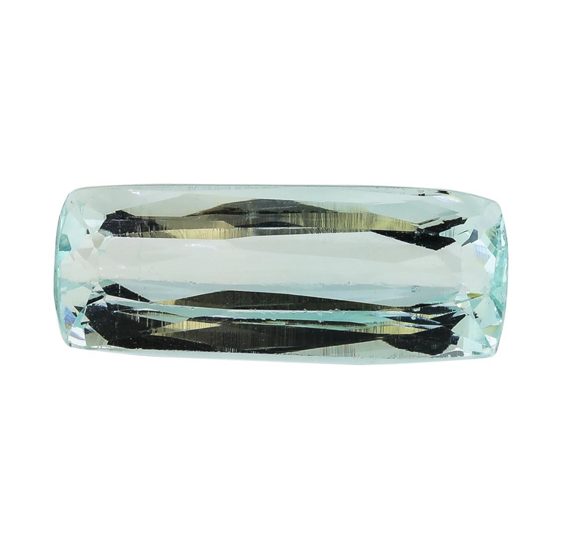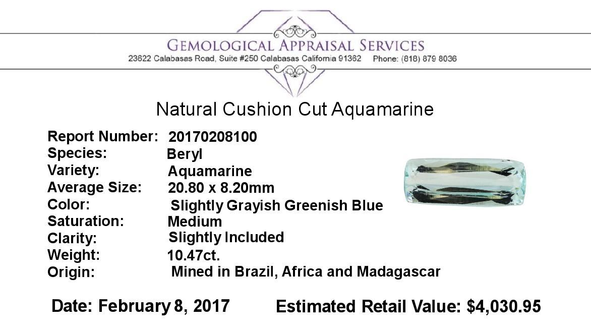 One natural cushion cut aquamarine with an exact weight of 10.47ct., clarity is slightly included, slightly grayish greenish blue, medium. Gemological Appraisals Services estimates the retail value at $4030.95 GAS Appraised.