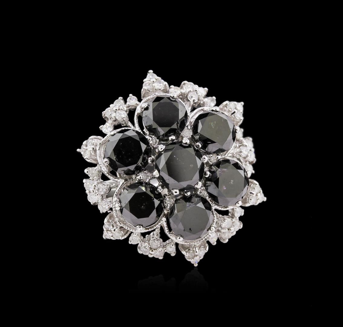 One lady's polished, stamped and electronically tested solid 14k white gold ring mounted with: 7 Genuine Round Black Diamonds and 54 Genuine Round Full Diamonds. This item weighs 9.73 grams and fits a finger size 6.50. The setting measures 28.88 x 25.62 mm and the band measures 2.85 mm graduating up to 6.16 mm at the center of the shank. The condition is brand new. The gemstones have been analyzed in the mounting. Main Gemstones: Identity: Genuine black diamond. Cut: Round (faceted). Measurements: 6.53 x 5.01 mm (average). Quantity: 7. Carat Weight: 9.73 ctw (est.) Clarity Grade: Opaque. Color Grade: Black. Cut Grade: 5-Good. Adjacent Gemstone: Identity: Genuine diamond. Cut: Round full (faceted). Measurements: 1.30 mm (est.) (no depth) (average). Quantity: 54. Carat Weight: 0.78 ctw (est.). Clarity Grade: I-1. Color Grade: G-H. Cut Grade: 6-very good - good. Total Diamond Carat Weight: 10.51ctw. Item Gram Weight: 9.73 grams. GLA Appraised at $16,144.00.