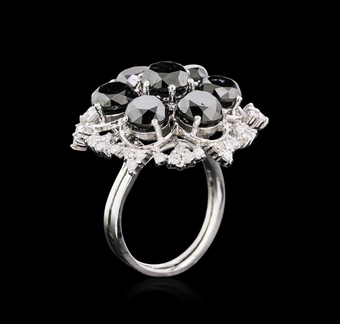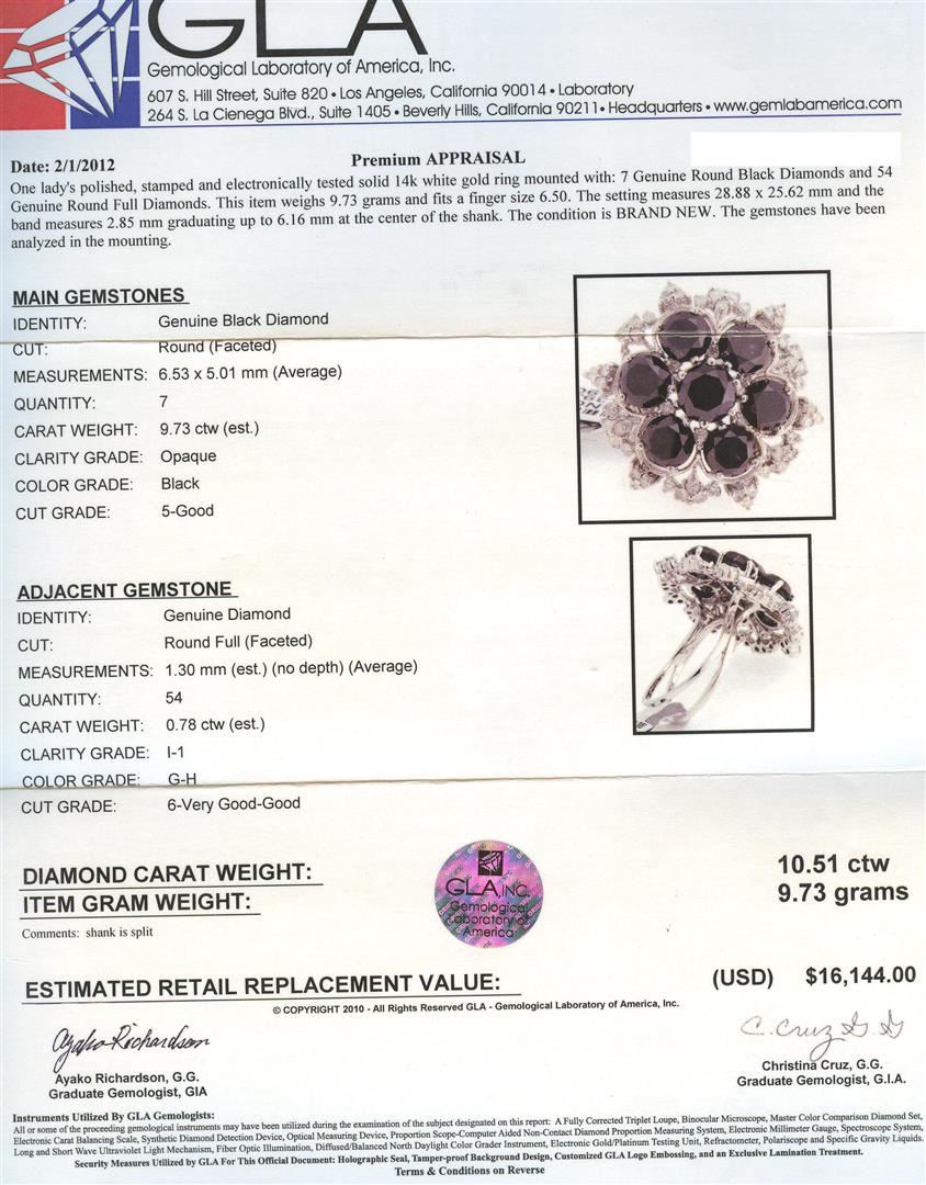 One lady's polished, stamped and electronically tested solid 14k white gold ring mounted with: 7 Genuine Round Black Diamonds and 54 Genuine Round Full Diamonds. This item weighs 9.73 grams and fits a finger size 6.50. The setting measures 28.88 x 25.62 mm and the band measures 2.85 mm graduating up to 6.16 mm at the center of the shank. The condition is brand new. The gemstones have been analyzed in the mounting. Main Gemstones: Identity: Genuine black diamond. Cut: Round (faceted). Measurements: 6.53 x 5.01 mm (average). Quantity: 7. Carat Weight: 9.73 ctw (est.) Clarity Grade: Opaque. Color Grade: Black. Cut Grade: 5-Good. Adjacent Gemstone: Identity: Genuine diamond. Cut: Round full (faceted). Measurements: 1.30 mm (est.) (no depth) (average). Quantity: 54. Carat Weight: 0.78 ctw (est.). Clarity Grade: I-1. Color Grade: G-H. Cut Grade: 6-very good - good. Total Diamond Carat Weight: 10.51ctw. Item Gram Weight: 9.73 grams. GLA Appraised at $16,144.00.