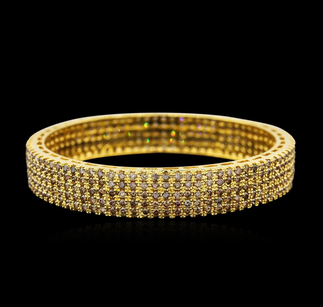 One electronically tested 14KT yellow gold ladies cast diamond bangle bracelet with a bright polish finish. 2.80" in diameter. Identified with markings of "14K". Condition is new. Containing: Four Hundred Twenty prong set round brilliant cut diamonds, measuring 1.90 - 1.90 x 1.14mm (depth est.) approximate total weight of 420 Stones = 10.54ct. Clarity: VS-2, Cut is Very Good. Diamonds are graded in the mounting, unless otherwise stated. Total Weight of Diamonds 10.54ct. Total Weight of Bangle Bracelet 50.60gm. GGL Appraised at $14,530.00.