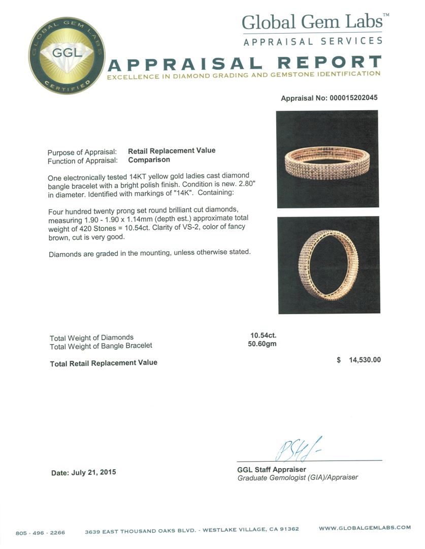 One electronically tested 14KT yellow gold ladies cast diamond bangle bracelet with a bright polish finish. 2.80" in diameter. Identified with markings of "14K". Condition is new. Containing: Four Hundred Twenty prong set round brilliant cut diamonds, measuring 1.90 - 1.90 x 1.14mm (depth est.) approximate total weight of 420 Stones = 10.54ct. Clarity: VS-2, Cut is Very Good. Diamonds are graded in the mounting, unless otherwise stated. Total Weight of Diamonds 10.54ct. Total Weight of Bangle Bracelet 50.60gm. GGL Appraised at $14,530.00.