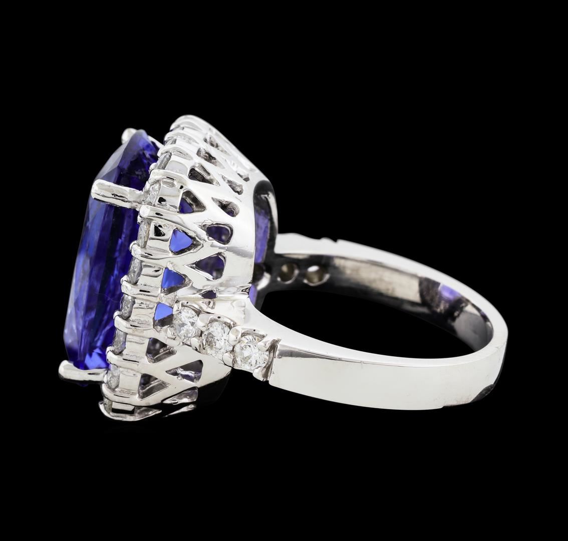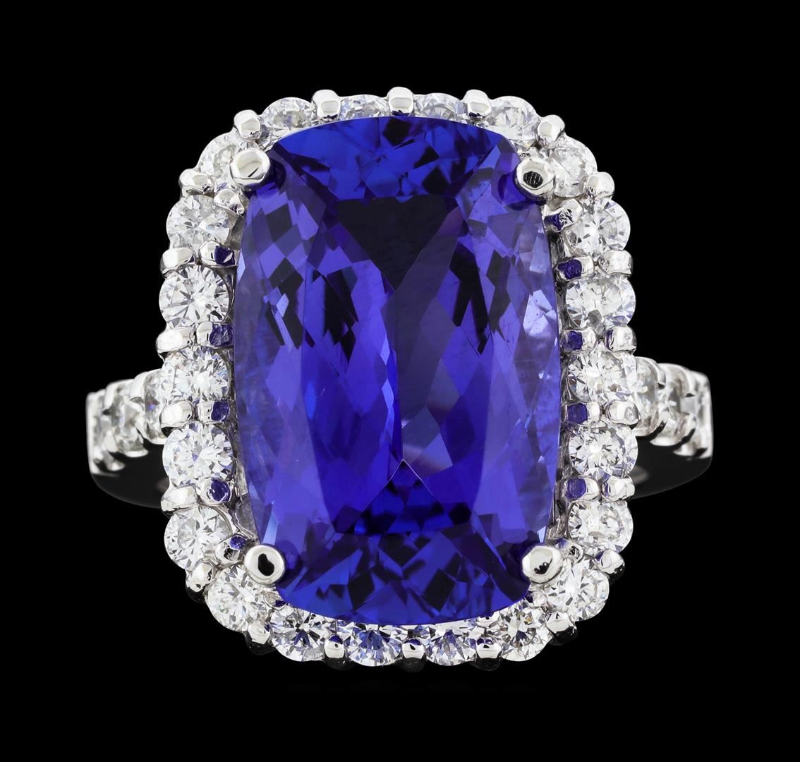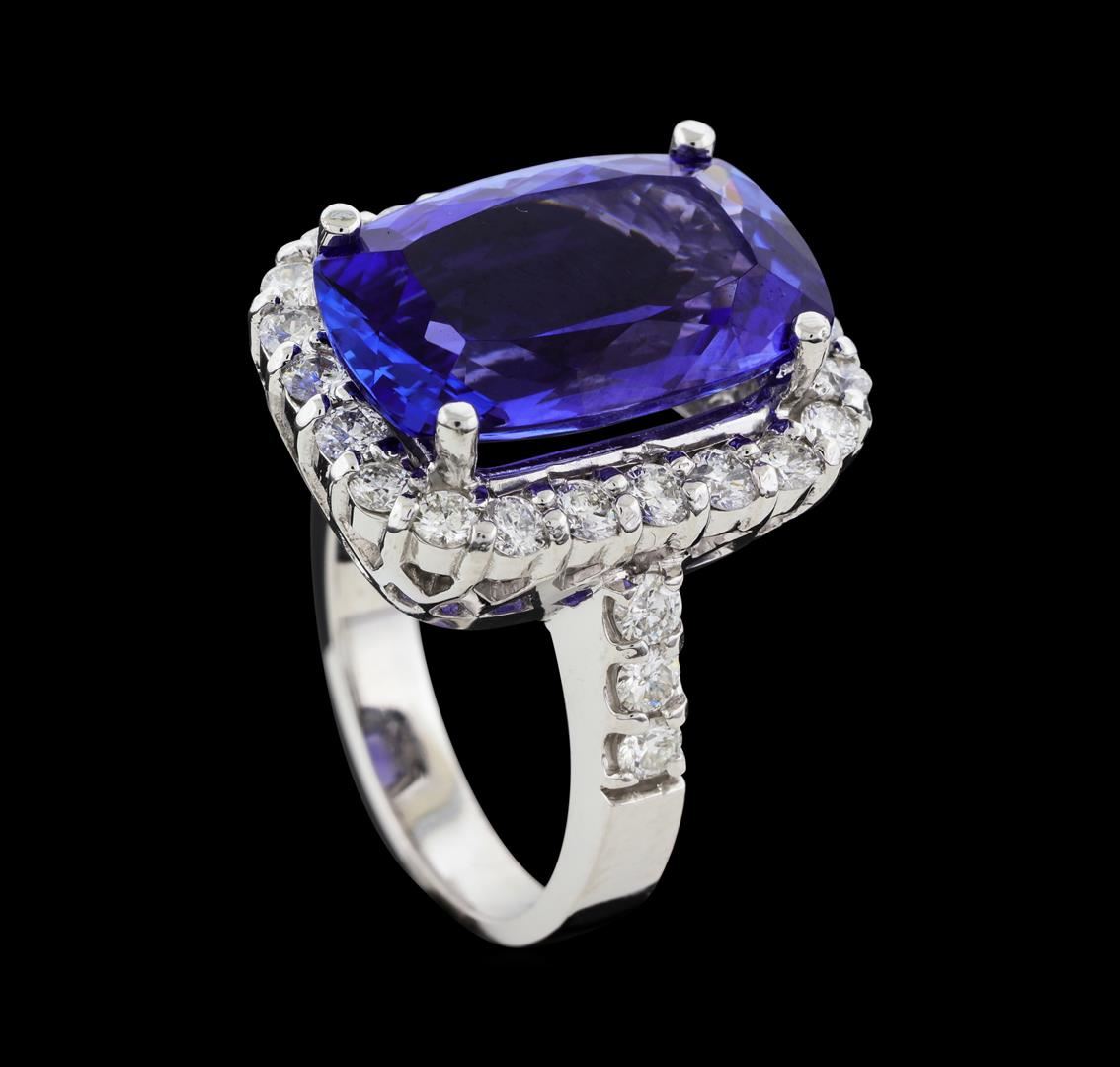 One electronically tested 14KT white gold lady's cast fashion ring with a basket halo with a bright polish finish. The featured lady's ring has a shank measuring 3.25 millimeters wide. Identified with markings of 'K14'. Condition is new, good workmanship. Containing: One prong set rectangular cushion modified brilliant cut natural tanzanite, measuring 17.30 x 11.05 x 7.12mm, (depth est.) approximate weight of 10.59ct., clarity is eye clean, medium dark, moderately strong, violetish blue color, (GIA vB 6/4), cut is very good. Transmitting light with no distortion, transparent. Colored gemstones are presumed to have been subjected to commonly used enhancement processes. Graded in the setting. Six prong set round brilliant cut diamonds, measuring 2.60 - 2.50 x 1.58mm (depth est.) approximate total weight of 6 Stones = 0.38ct. Graded in the setting. Clarity SI-1 to I-1. Color: H - I Cut Good Twenty-Two prong set round brilliant cut diamonds, measuring 2.30 - 2.25 x 1.42mm (depth est.) approximate total weight of 22 Stones = 1.00ct. Graded in the setting. Clarity SI-1 to SI-3. Color: G - H Cut Good. Total Weight of Colored Stones 10.59ct.. Total Weight of Diamonds 1.38ct.. Total Weight of Ring 11.90gm. GAS Appraised at $20,875.00.