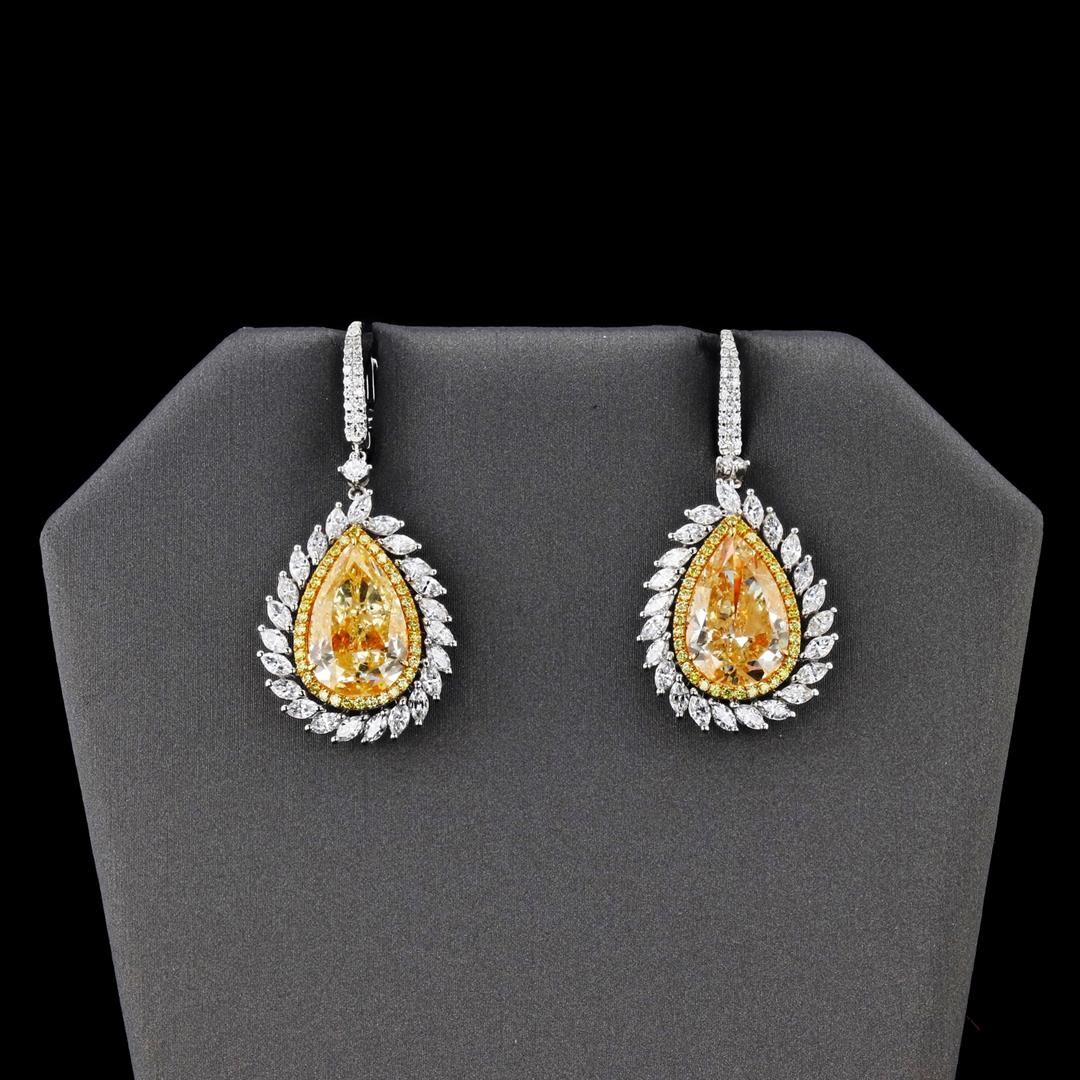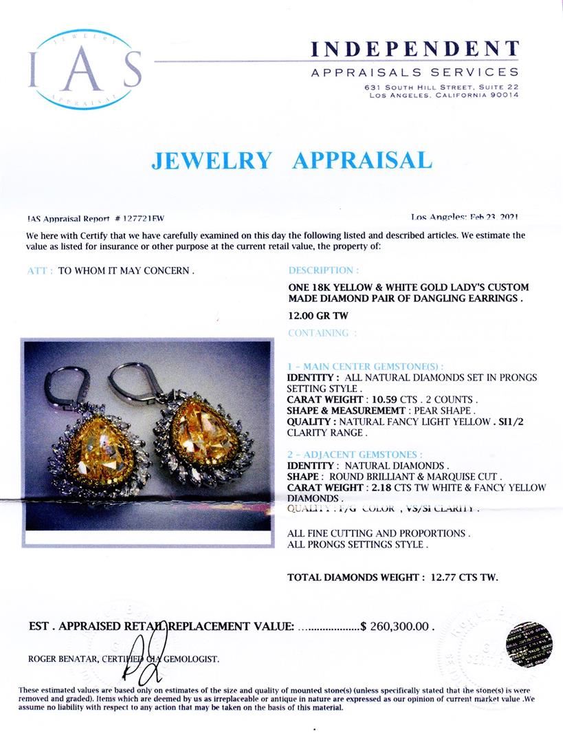 10.59ctw Yellow Diamond and 2.18ctw White Diamond 18K Yellow and White Gold Dangling Earrings. Please see Photos and Description for all available information. This pair of dangling earrings is a timeless piece that embodies the very essence of fashion and sophistication. The earrings are made from 18K yellow and white gold and showcase a total of 10.59ctw yellow diamonds and 2.18ctw white diamonds. The yellow diamonds are exquisite, and the white diamonds are flawless. This pair of earrings is a perfect gift for the woman who is always in fashion.