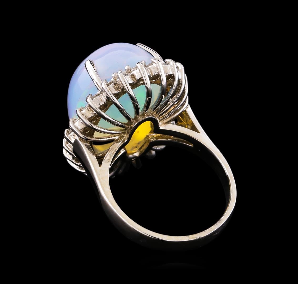 One electronically tested 14KT white gold lady's cast fashion ring with a basket halo with a bright polish finish. The featured lady's ring has a shank measuring 2.87 millimeters wide. Identified with markings of "14K". Condition is new, good workmanship. Containing: One crystal opal that is cut in a oval shaped cabochon and is prong set, measuring 18.35 mm long x 13.61 mm wide, and 9.50 mm thick and the approximate weight is 10.60 carats. The opal has a somewhat bright, blue-green play of color (fire) in a rolling flashfire pattern; a high dome; a good cut; no inclusions; consistent in its brightness and pattern; and is not directional. Graded in the setting. Twenty-Four prong set round brilliant cut diamonds, measuring 2.10 - 2.00 x 1.27mm (depth est.) approximate total weight of 24 Stones = 0.80ct. Graded in the setting. Clarity: SI-1 to SI-2. Color: H - I. Cut Good. Total Weight of Diamonds 0.80ct. Total Weight of Opals 10.60ct. Total Weight of Ring 9.20gm. GAS Appraised at $6,775.00.