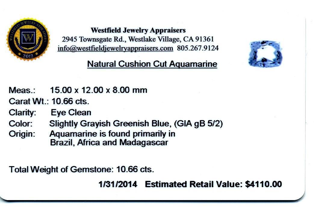 10.66ct. Natural Cushion Cut Aquamarine Westfield Appraised at $4,110.00.