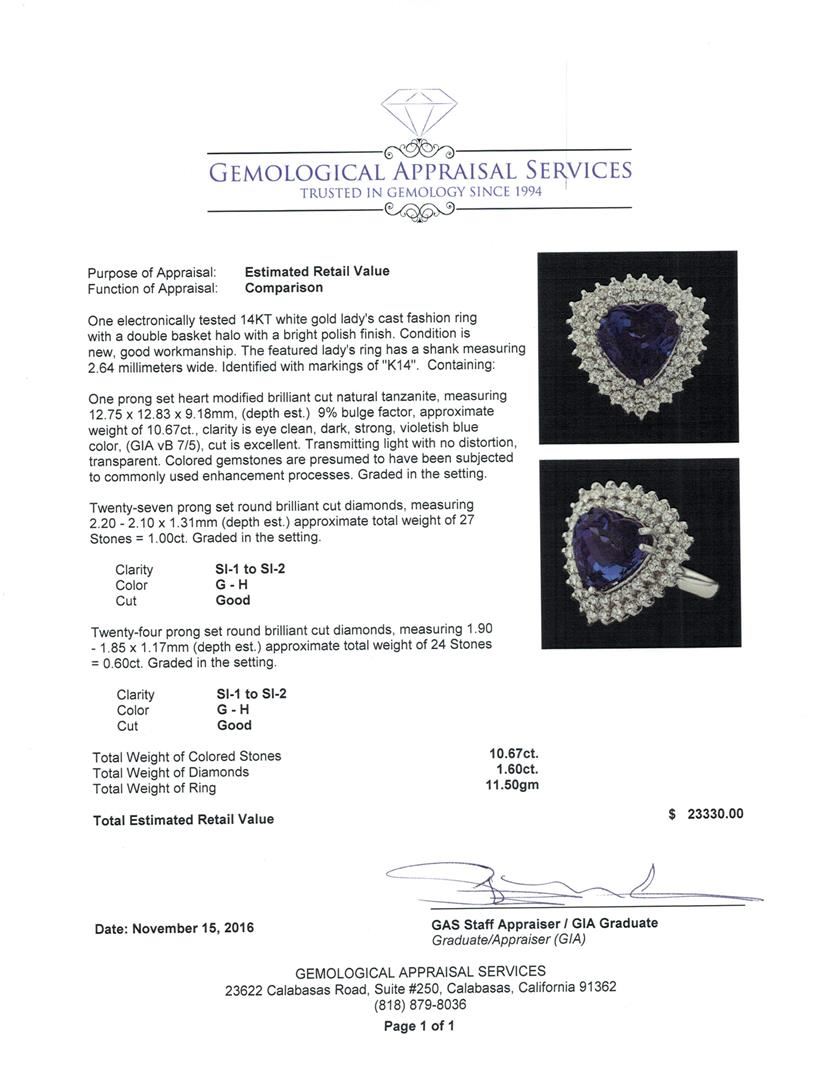 One electronically tested 14KT white gold lady's cast fashion ring with a double basket halo with a bright polish finish. The featured lady's ring has a shank measuring 2.64 millimeters wide. Identified with markings of 'K14'. Condition is new, good workmanship. Containing: One prong set heart modified brilliant cut natural tanzanite, measuring 12.75 x 12.83 x 9.18mm, (depth est.) 9%. bulge factor, approximate weight of 10.67ct., clarity is eye clean, dark, strong, violetish blue color, (GIA vB 7/5), cut is excellent. Transmitting light with no distortion, transparent. Colored gemstones are presumed to have been subjected to commonly used enhancement processes. Graded in the setting. Twenty-Seven prong set round brilliant cut diamonds, measuring 2.20 - 2.10 x 1.31mm (depth est.) approximate total weight of 27 Stones = 1.00ct. Graded in the setting. Clarity SI-1 to SI-2. Color: G - H Cut Good Twenty-Four prong set round brilliant cut diamonds, measuring 1.90 - 1.85 x 1.17mm (depth est.) approximate total weight of 24 Stones = 0.60ct. Graded in the setting. Clarity SI-1 to SI-2. Color: G - H Cut Good. Total Weight of Colored Stones 10.67ct.. Total Weight of Diamonds 1.60ct.. Total Weight of Ring 11.50gm. GAS Appraised at $23,330.00.