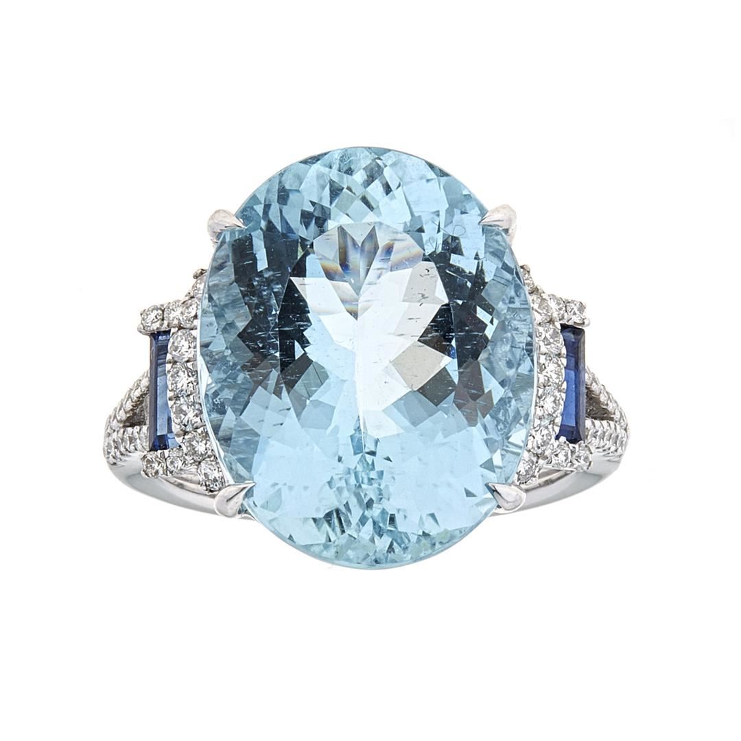 One Lady's Aquamarine, Sapphire, and Diamond Ring. Setting: 14 Kt. White Gold Mounting. Additional: 2 Baguette Sapphires = 0.65 Cts. TWT (Blue/Transparent & 50 Round Diamonds = 0.35 Cts. TWT (G-H/VS-SI). Center Gem Stone Information: Species: Natural Beryl. Variety: Aquamarine. Shape and Cut: Oval Mixed Cut. Measurements: 17.10 x 13.39 x 8.68 mm. Transparency: Transparent. Color Hue: Blue. Saturation: Moderate. Total Weight: 5.35 grams.