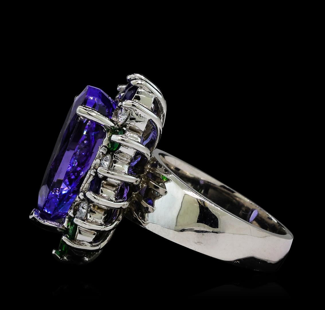One prong set pear mixed cut natural tanzanite, measuring 16.50 x 11.10 x 8.30mm, 5%. bulge factor, approximate weight of 10.69ct., clarity is eye clean, type I, medium, very slightly grayish, bluish violet color, (GIA bV 5/3), cut is good. Transmitting light with no distortion, transparent. Graded in the setting. Tanzanite is a very rare gemstone that is only found in the country of Tanzania. Originally discovered in 1967. Tiffany & Company, named the stone Tanzanite. It is found in the Usumburu Mountains that border the Umba Valley of northern Tanzania. Tanzanite occurs in gray, brown, violet, blue, reddish-purple, & green. The gem is interesting because of its exceptional pleochroism. Rotated in different directions a tanzanite will exhibit multiple changes of color. Tanzanite has a low tolerance to ultrasonic cleaning, and should not be cleaned using this method. Five prong set round mixed cut natural tsavorite garnets, measuring 2.90 - 2.80 x 1.85 mm, approximate total weight of 0.55ct., clarity is eye clean, type II, medium, moderately strong, slightly yellowish green color, (GIA slyG 5/4), cut is good. Transmitting light with no distortion, transparent. Measurements & the color grade are an average for the group. Graded in the setting. Four prong set round mixed cut natural blue sapphires, measuring 3.00 - 2.80 x 1.89 mm, approximate total weight of 0.56ct., clarity is slightly included, type II, medium dark, moderately strong, blue color, (GIA B 6/4), cut is good. Transmitting light with a minimum of distortion, transparent. Naturally occurring internal & external characteristics are present. Indications of laboratory high temperature diffusion treatment. Measurements & the color grade are an average for the group. Graded in the setting. Six prong set round brilliant cut diamonds, measuring 3.00 - 3.00 x 1.80mm (depth est.) approximate total weight of 6 Stones = 0.62ct. The color and clarity grades reflect the entire ranges of color and clarity for this group. Graded in the setting. Clarity SI-2 to I-2. Color: F - I. Total Weight of Colored Stones 11.80ct.. Total Weight of Diamonds 0.62ct.. Total Weight of Ring 13.67gm. AIG Appraised at $26,345.00.