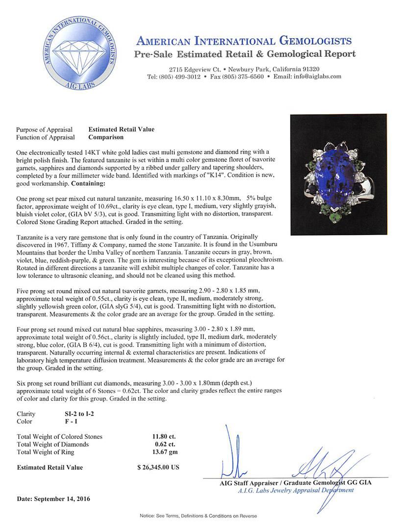 One prong set pear mixed cut natural tanzanite, measuring 16.50 x 11.10 x 8.30mm, 5%. bulge factor, approximate weight of 10.69ct., clarity is eye clean, type I, medium, very slightly grayish, bluish violet color, (GIA bV 5/3), cut is good. Transmitting light with no distortion, transparent. Graded in the setting. Tanzanite is a very rare gemstone that is only found in the country of Tanzania. Originally discovered in 1967. Tiffany & Company, named the stone Tanzanite. It is found in the Usumburu Mountains that border the Umba Valley of northern Tanzania. Tanzanite occurs in gray, brown, violet, blue, reddish-purple, & green. The gem is interesting because of its exceptional pleochroism. Rotated in different directions a tanzanite will exhibit multiple changes of color. Tanzanite has a low tolerance to ultrasonic cleaning, and should not be cleaned using this method. Five prong set round mixed cut natural tsavorite garnets, measuring 2.90 - 2.80 x 1.85 mm, approximate total weight of 0.55ct., clarity is eye clean, type II, medium, moderately strong, slightly yellowish green color, (GIA slyG 5/4), cut is good. Transmitting light with no distortion, transparent. Measurements & the color grade are an average for the group. Graded in the setting. Four prong set round mixed cut natural blue sapphires, measuring 3.00 - 2.80 x 1.89 mm, approximate total weight of 0.56ct., clarity is slightly included, type II, medium dark, moderately strong, blue color, (GIA B 6/4), cut is good. Transmitting light with a minimum of distortion, transparent. Naturally occurring internal & external characteristics are present. Indications of laboratory high temperature diffusion treatment. Measurements & the color grade are an average for the group. Graded in the setting. Six prong set round brilliant cut diamonds, measuring 3.00 - 3.00 x 1.80mm (depth est.) approximate total weight of 6 Stones = 0.62ct. The color and clarity grades reflect the entire ranges of color and clarity for this group. Graded in the setting. Clarity SI-2 to I-2. Color: F - I. Total Weight of Colored Stones 11.80ct.. Total Weight of Diamonds 0.62ct.. Total Weight of Ring 13.67gm. AIG Appraised at $26,345.00.