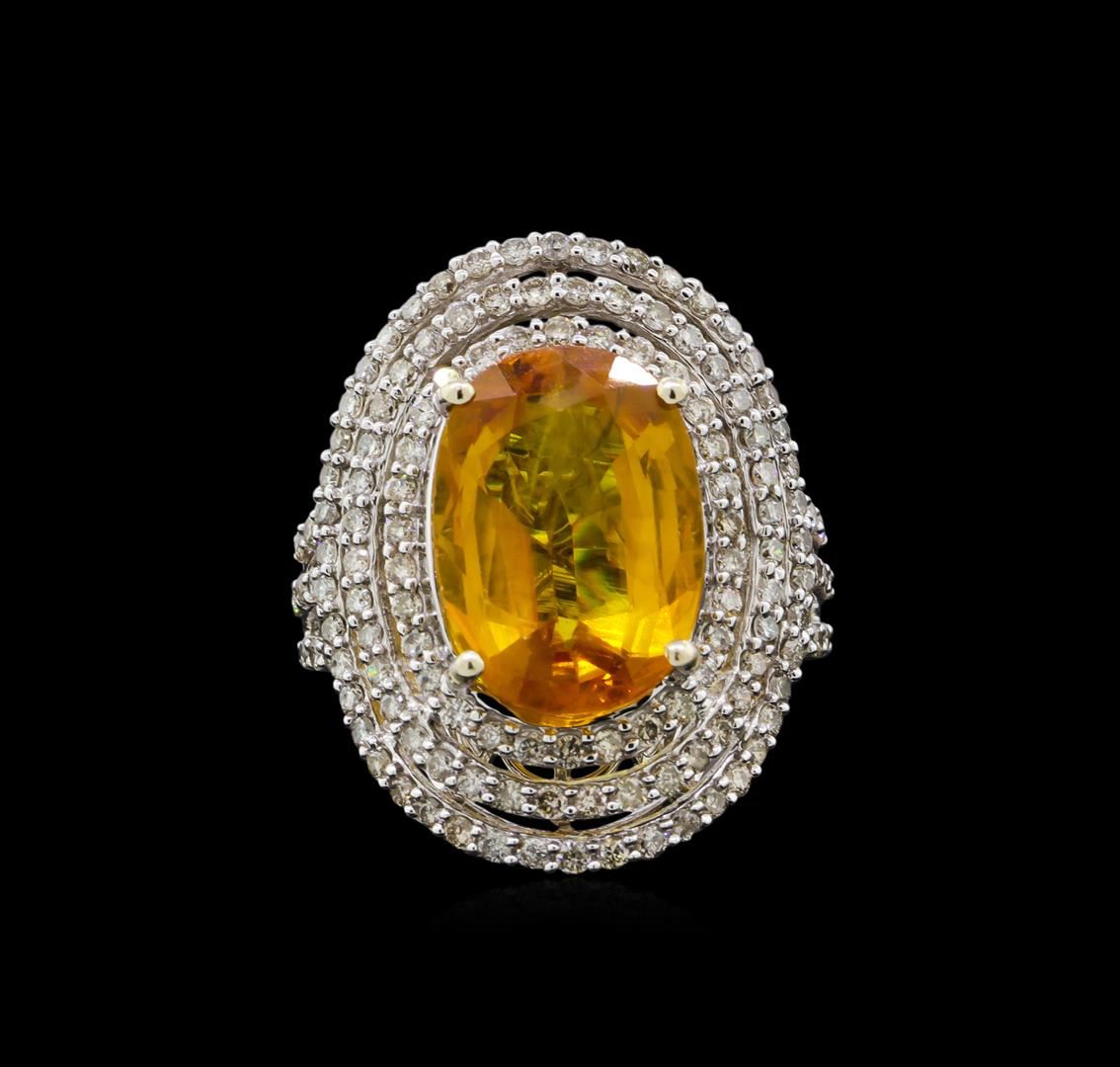 One electronically tested 14KT white gold ladies cast yellow sapphire and diamond ring with a bright polish finish. The featured yellow sapphire is set within three tiered diamond bezels supported by diamond set three-way split shoulders, completed by a two and one-half millimeter wide band. Trademark is Orianne. Identified with markings of "14K". Condition is new, good workmanship. Containing: One prong set oval mixed cut natural yellow sapphire, measuring 15.50 x 11.30 x 6.30mm, 15%. bulge factor, approximate weight of 10.69ct., clarity is moderately included, type II, medium, slightly brownish, orangy yellow color, (GIA oY 5/2), cut is good. Transmitting light with a minimum of distortion, transparent. Naturally occurring internal & external characteristics are present. Graded in the setting. One Hundred Thirty-Two prong set round brilliant cut diamonds, measuring 1.50 - 1.40 x 0.87mm (depth est.) approximate total weight of 132 Stones = 1.57ct. Graded in the setting. Clarity: I-1 to I-2. Color: H - I. Total Weight of Colored Stones 10.69ct. Total Weight of Diamonds 1.57ct. Total Weight of Ring 10.51gm. AIG Appraised at $32,610.00.