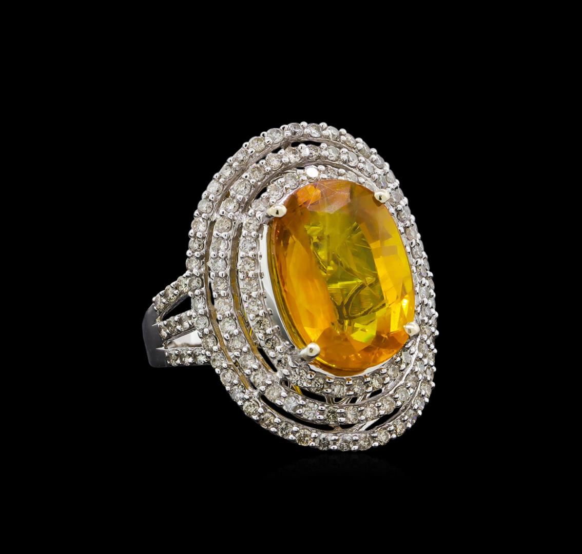 One electronically tested 14KT white gold ladies cast yellow sapphire and diamond ring with a bright polish finish. The featured yellow sapphire is set within three tiered diamond bezels supported by diamond set three-way split shoulders, completed by a two and one-half millimeter wide band. Trademark is Orianne. Identified with markings of "14K". Condition is new, good workmanship. Containing: One prong set oval mixed cut natural yellow sapphire, measuring 15.50 x 11.30 x 6.30mm, 15%. bulge factor, approximate weight of 10.69ct., clarity is moderately included, type II, medium, slightly brownish, orangy yellow color, (GIA oY 5/2), cut is good. Transmitting light with a minimum of distortion, transparent. Naturally occurring internal & external characteristics are present. Graded in the setting. One Hundred Thirty-Two prong set round brilliant cut diamonds, measuring 1.50 - 1.40 x 0.87mm (depth est.) approximate total weight of 132 Stones = 1.57ct. Graded in the setting. Clarity: I-1 to I-2. Color: H - I. Total Weight of Colored Stones 10.69ct. Total Weight of Diamonds 1.57ct. Total Weight of Ring 10.51gm. AIG Appraised at $32,610.00.