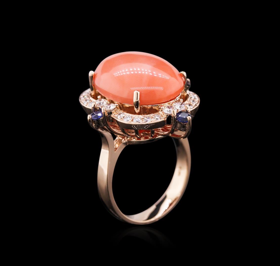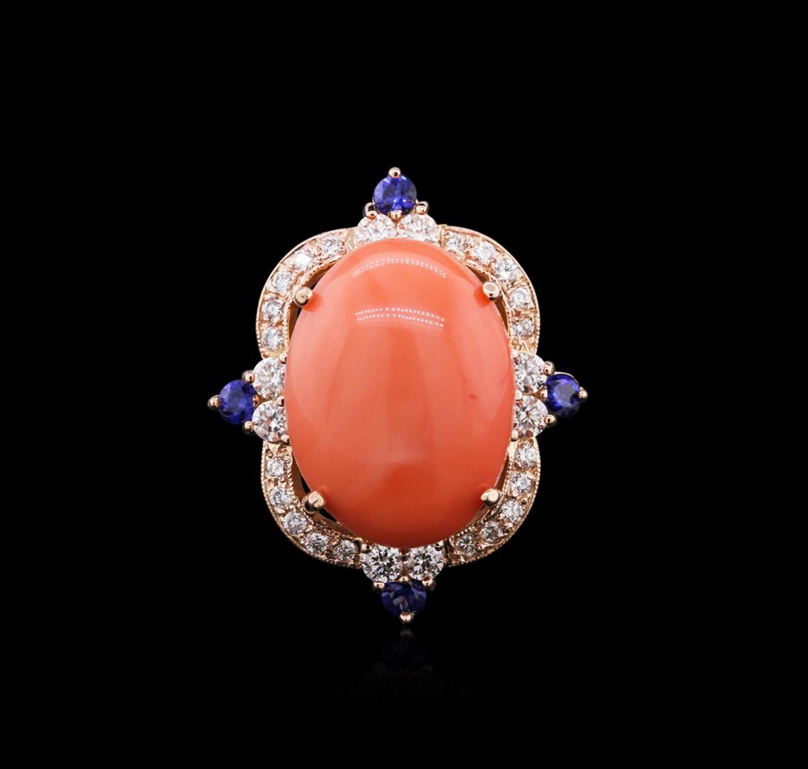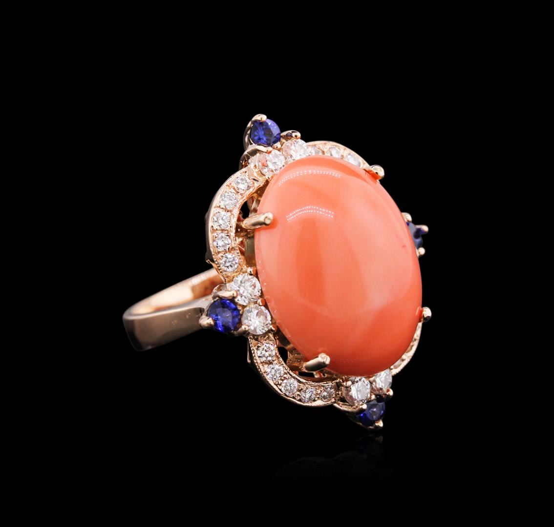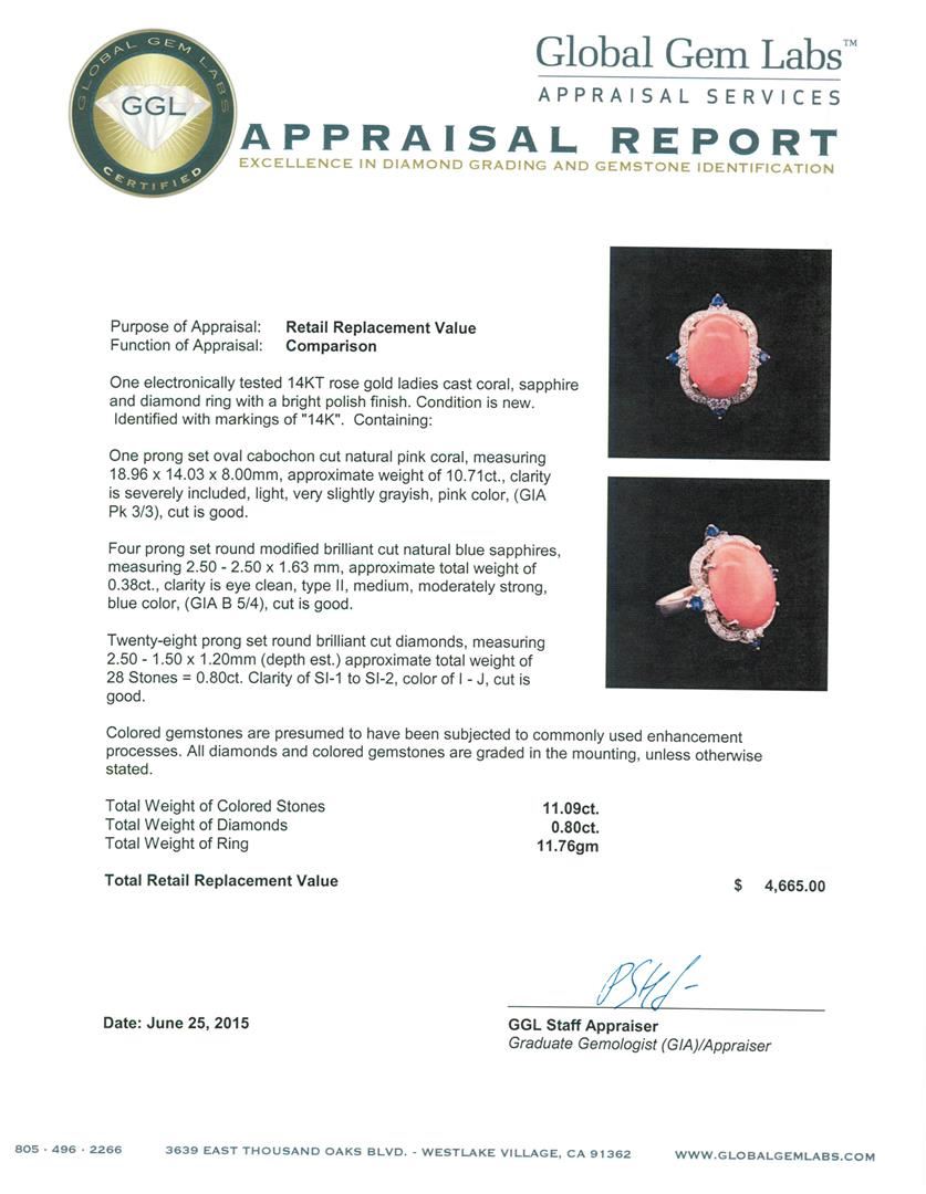 One electronically tested 14KT rose gold ladies cast coral, sapphire and diamond ring with a bright polish finish. Identified with markings of "14K". Condition is new. Containing: One prong set oval cabochon cut natural pink coral, measuring 18.96 x 14.03 x 8.00mm, approximate weight of 10.71ct., clarity is severely included, light, very slightly grayish, pink color, (GIA Pk 3/3), cut is good. Four prong set round modified brilliant cut natural blue sapphires, measuring 2.50 - 2.50 x 1.63 mm, approximate. Total Weight of 0.38ct., clarity is eye clean, type II, medium, moderately strong, blue color, (GIA B 5/4), cut is good. Twenty-Eight prong set round brilliant cut diamonds, measuring 2.50 - 1.50 x 1.20mm (depth est.) approximate. Total Weight of 28 Stones = 0.80ct. Clarity: SI-1 to SI-2. Color: I - J, Cut is Good. Colored gemstones are presumed to have been subjected to commonly used enhancement processes. All diamonds and colored gemstones are graded in the mounting, unless otherwise stated. Total Weight of Colored Stones 11.09ct. Total Weight of Diamonds 0.80ct. Total Weight of Ring 11.76 grams. GGL Appraised at $4,665.00.
