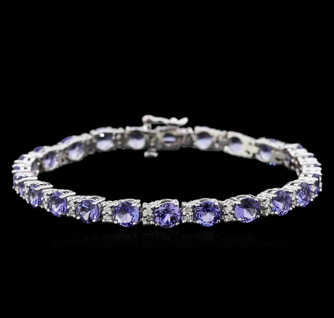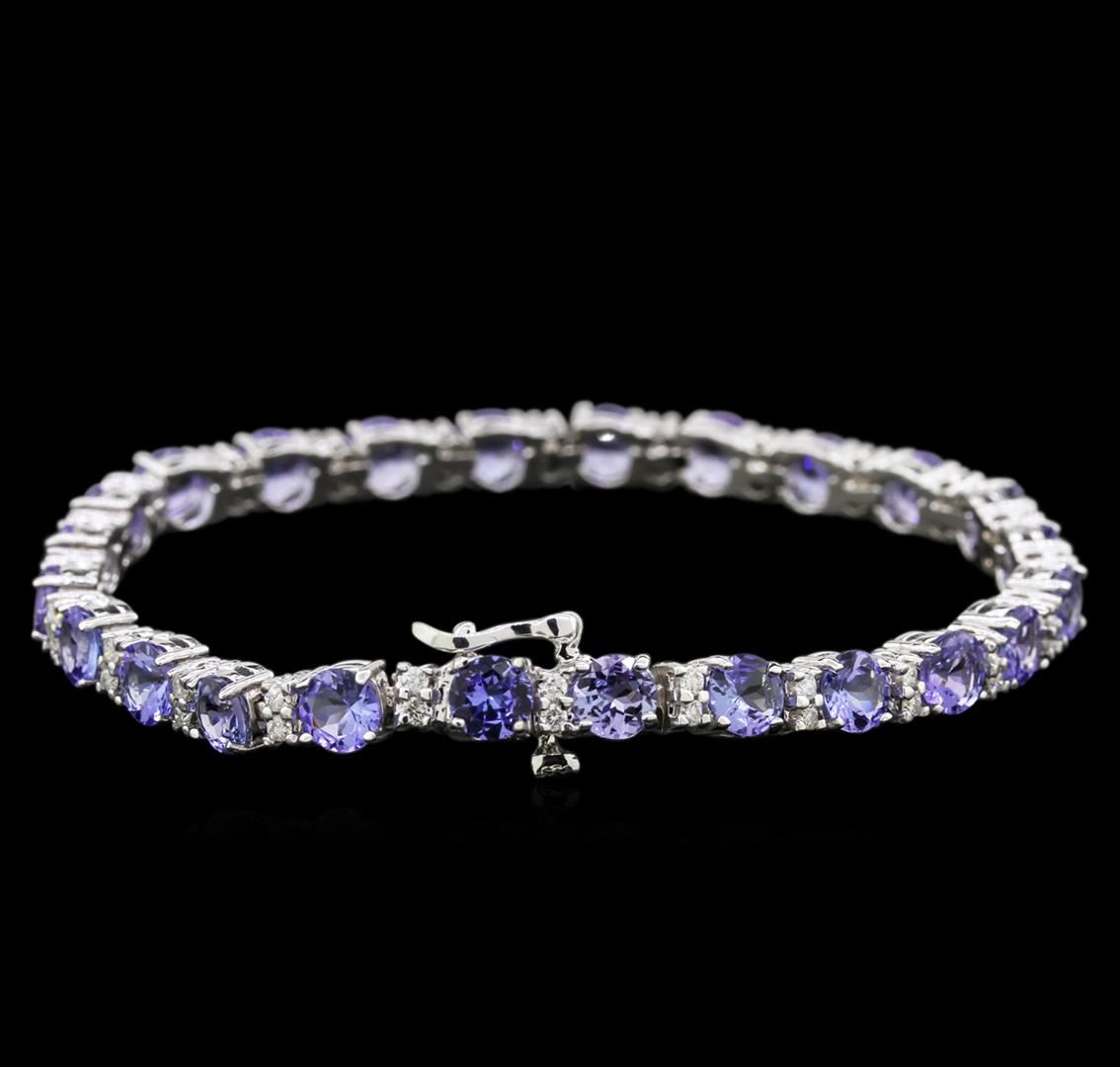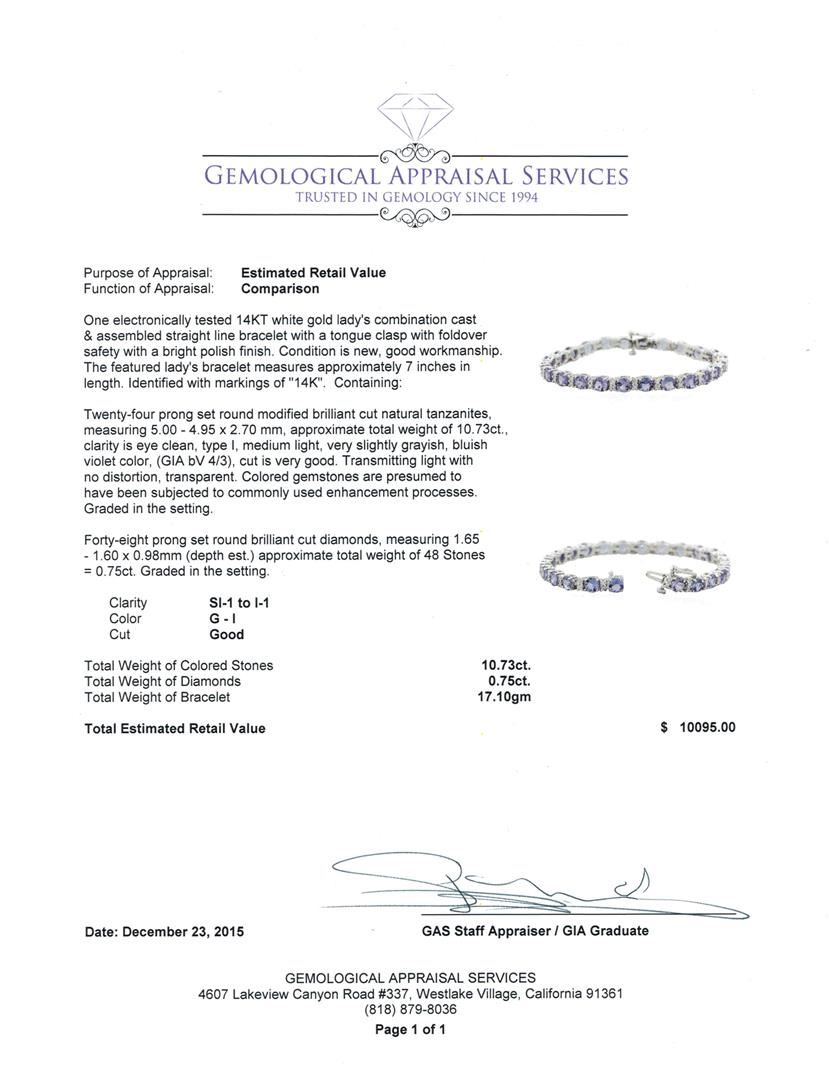 One electronically tested 14KT white gold lady's combination cast & assembled straight line bracelet with a tongue clasp with foldover safety with a bright polish finish. The featured lady's bracelet measures approximately 7 inches in length. Identified with markings of "14K". Condition is new, good workmanship. Containing: Twenty-four prong set round modified brilliant cut natural tanzanites, measuring 5.00 - 4.95 x 2.70 mm, approximate total weight of 10.73ct., clarity is eye clean, type I, medium light, very slightly grayish, bluish violet color, (GIA bV 4/3), cut is very good. Transmitting light with no distortion, transparent. Colored gemstones are presumed to have been subjected to commonly used enhancement processes. Graded in the setting. Forty-Eight prong set round brilliant cut diamonds, measuring 1.65 - 1.60 x 0.98mm (depth est.) approximate total weight of 48 Stones = 0.75ct. Graded in the setting. Clarity: SI-1 to I-1. Color: G - I. Cut Good. Total Weight of Colored Stones 10.73ct. Total Weight of Diamonds 0.75ct. Total Weight of Bracelet 17.10gm. GAS Appraised at $10,095.00.
