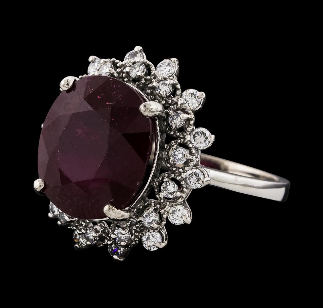 One Ruby and Diamond Ring featuring: 14KT White Gold with a total weight of 4.77 grams, Ruby with a total weight of 10.75ct, and 28 Diamonds with a total weight of 0.58ctw.